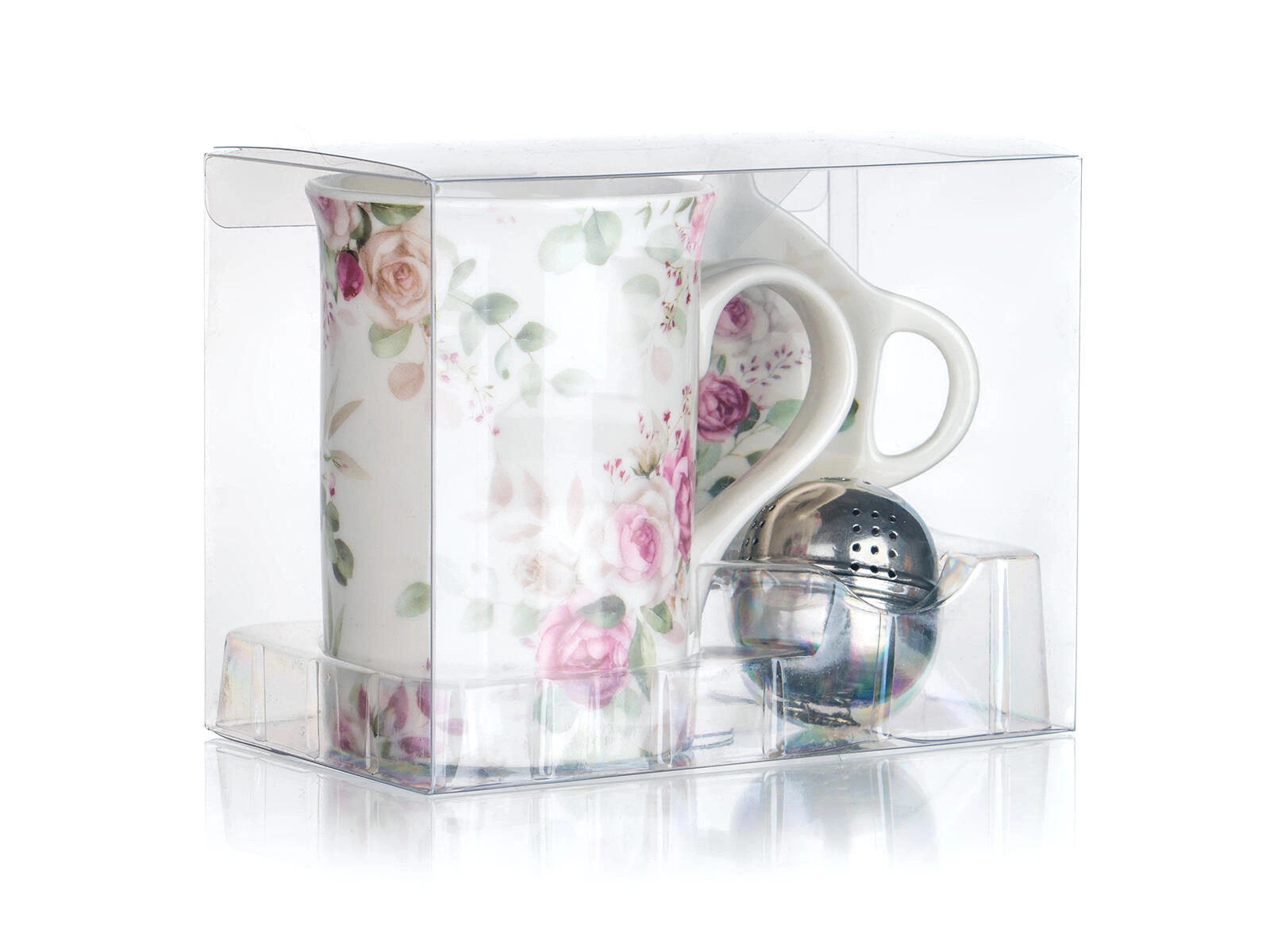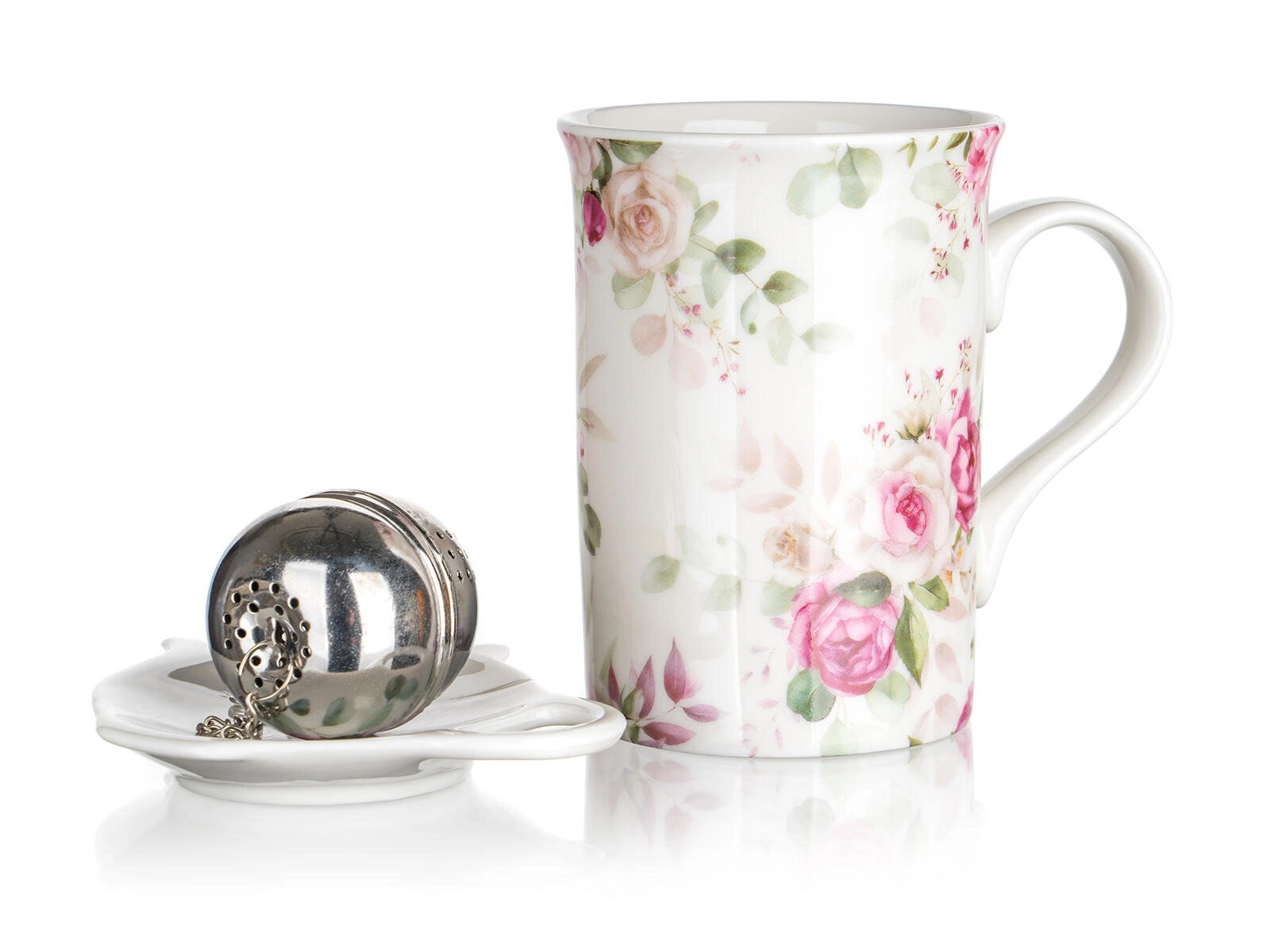 Set elegant pentru ceai cu motiv de trandafiri, ideal pentru iubitorii de ceai și veselă frumoasă. Conține o cană ceramică de 340 ml, o sită din inox practică pentru ceai vrac și o tăviță ceramică pentru a așeza sita. Design floral atemporal, prindere confortabilă și întreținere ușoară fac din acest set un accesoriu ideal pentru momentele zilnice de relaxare.