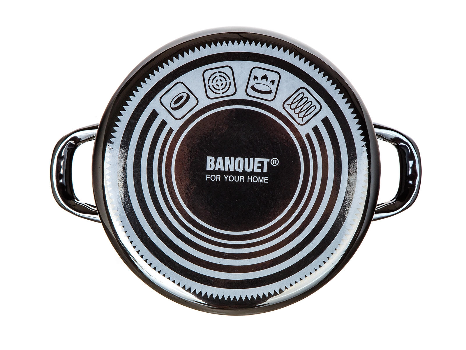 Suprafața emailată în negru metalizat este durabilă și ușor de curățat, iar mânerele laterale robuste asigură transport sigur.