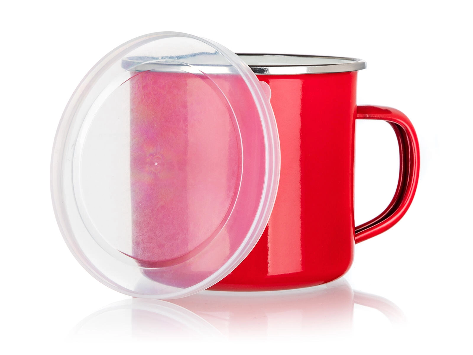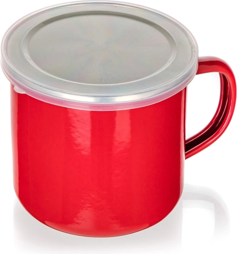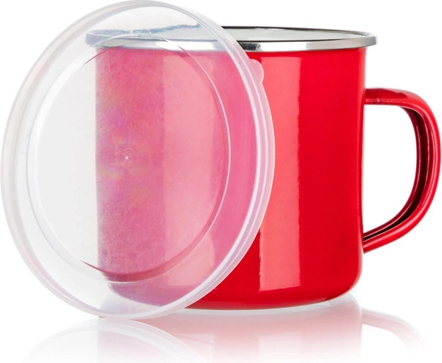 Cană emailată rezistentă și elegantă, în roșu intens, se potrivește perfect în orice bucătărie sau birou. Datorită capacului din plastic, vă bucurați de cafea, ceai sau cacao mai mult timp calde și cu risc mai mic de stropire. Suprafețul emailat dublu pe oțel carbon este solid, igienic și ușor de curățat.