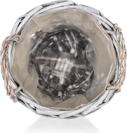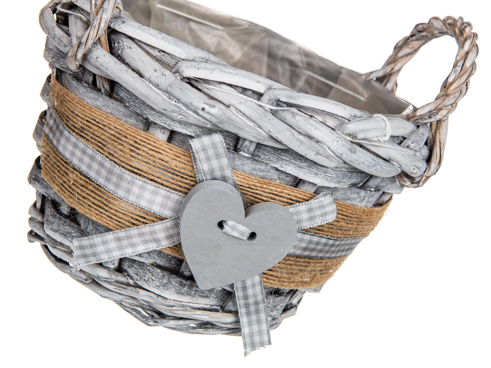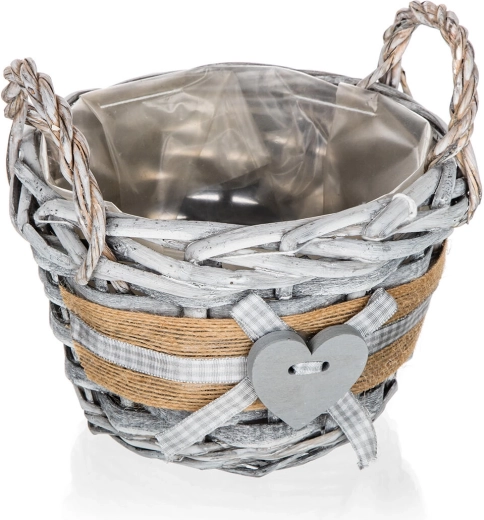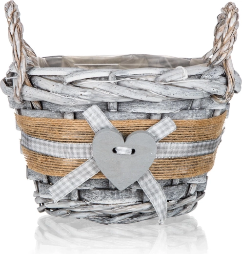 Acest coș rotund din nuiele GRIS aduce în interior o atmosferă caldă și naturală. Finisajul gri patinat, banda din iută, panglica în carouri și inima decorativă îl transformă într-un accesoriu stilat pentru living, hol sau bucătărie. Căptușeala interioară din plastic protejează suprafețele și permite aranjarea în siguranță a decorațiunilor, fără risc de umiditate.