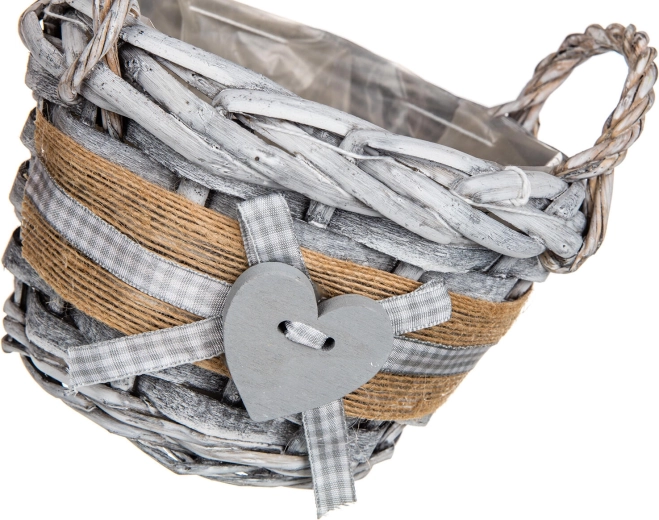 Combinația stilată de nuiele gri patinate, bandă de iută și fundiță cu inimă decorativă oferă casei tale o notă călduroasă, naturală.