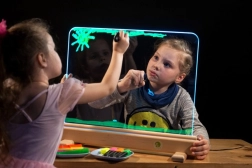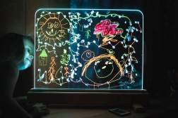 Aprindeți imaginația copiilor. Tabla luminoasă Jonely, cu o placă rezistentă din sticlă securizată, permite pictura cu acuarele, cu degetele și cu markere lavabile. Suprafeța se curăță ușor, iar datorită posibilității de desen pe ambele fețe, frații și surorile se pot distra simultan. LED-urile integrate în rama inferioară luminează frumos fiecare tușă și transformă desenele în opere strălucitoare.