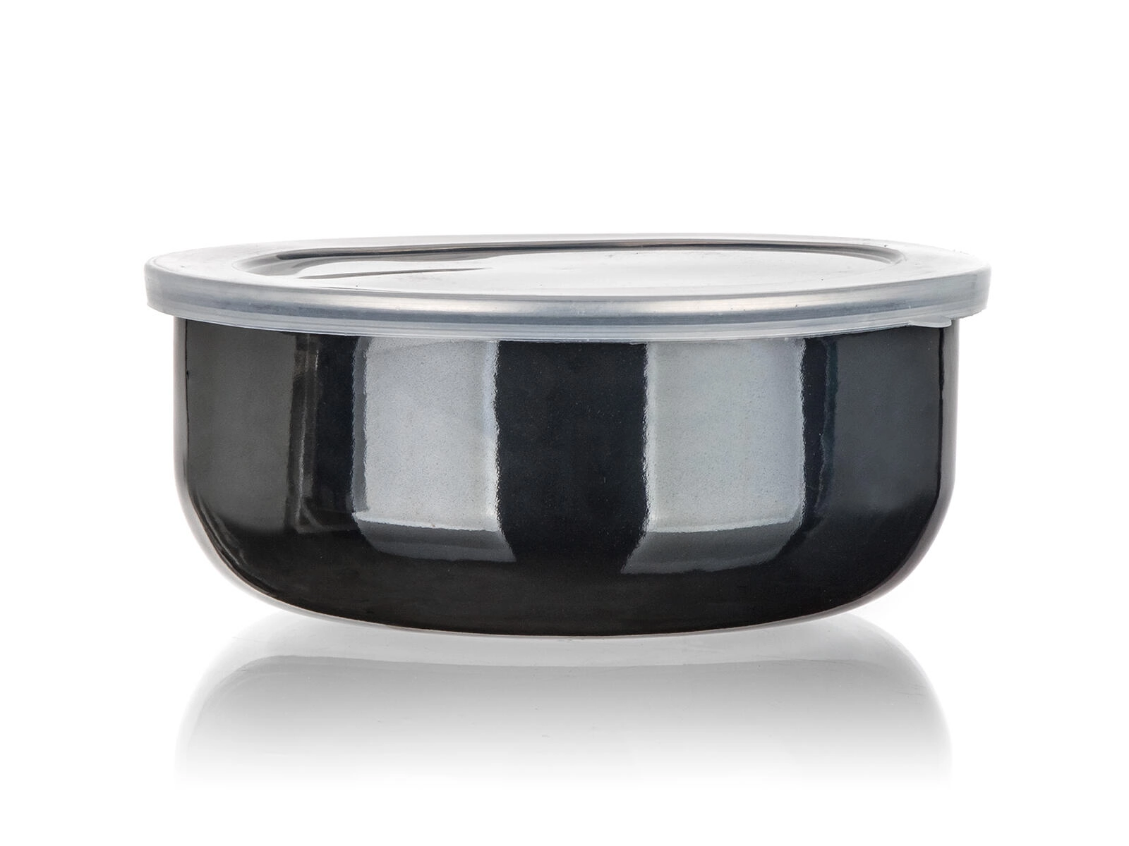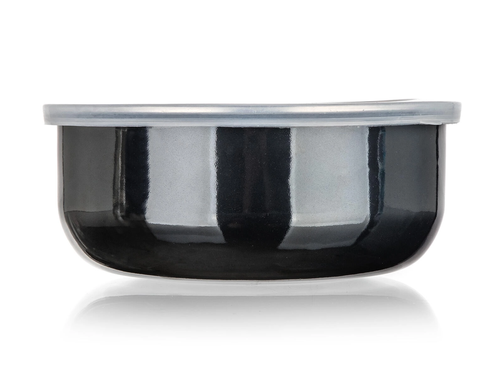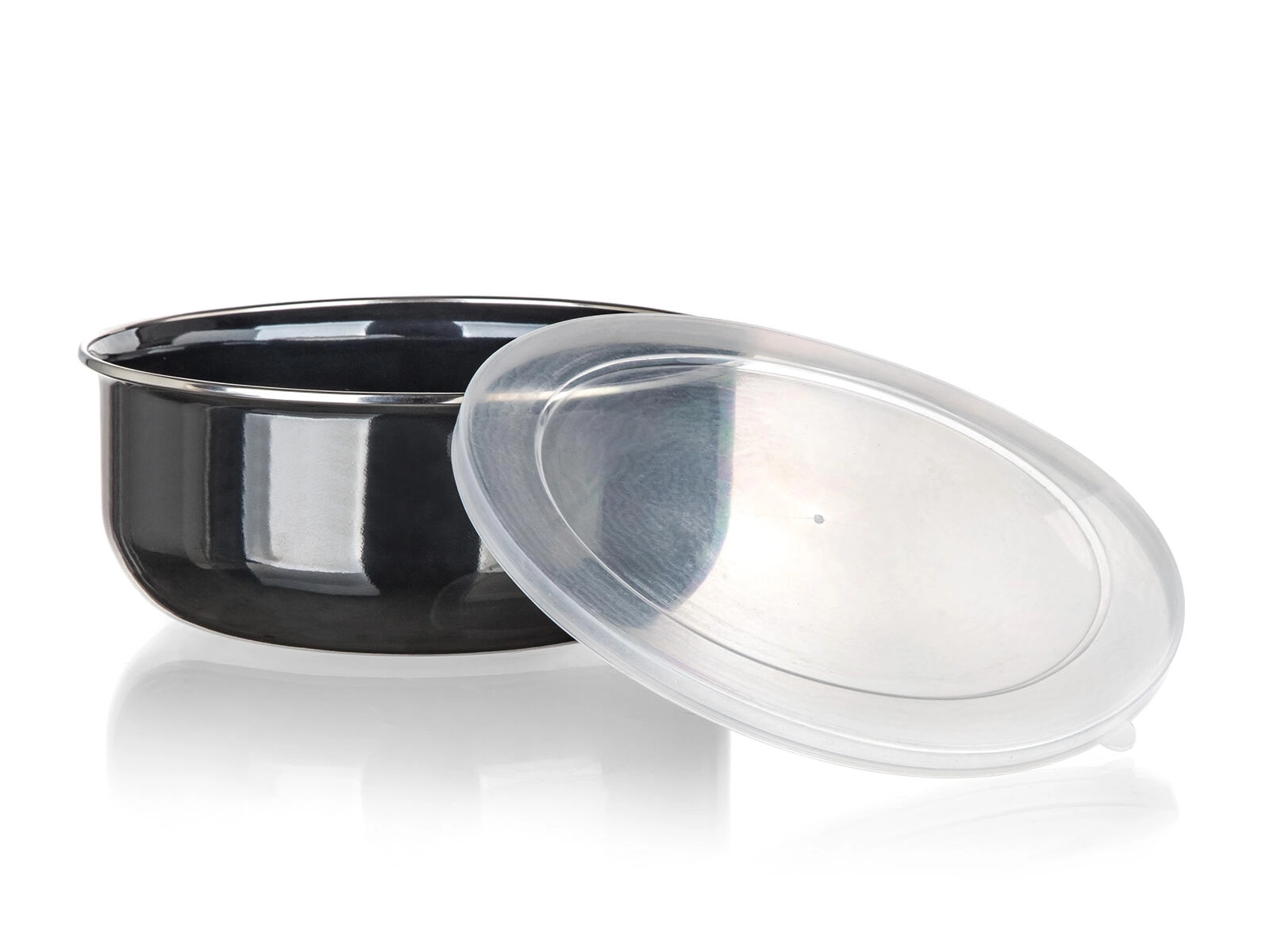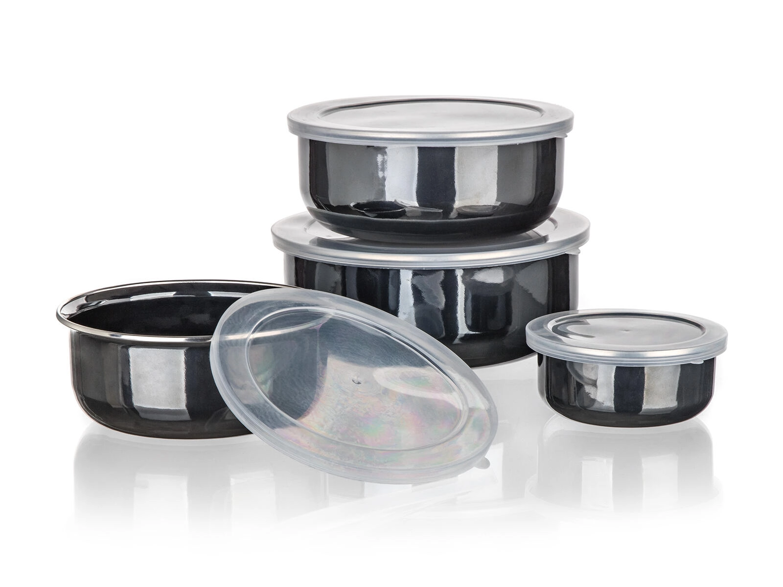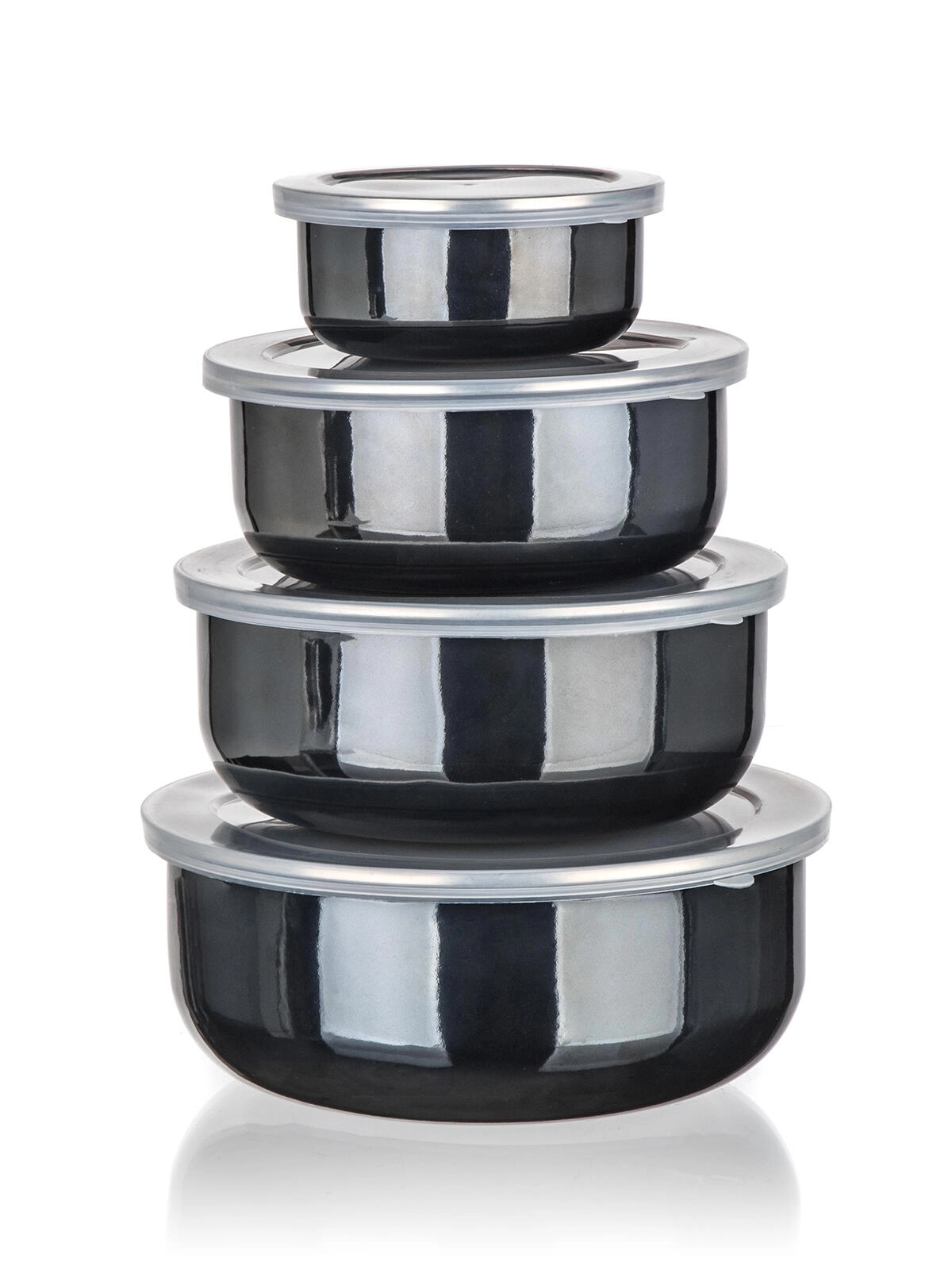 Set practic de boluri emailate cu capace din plastic METALIC Black, în elegantul negru, pentru utilizare zilnică. Patru dimensiuni cu design suprapunabil economisesc spațiul, capacele etanșe ajută la menținerea alimentelor proaspete mai mult timp, iar emailul rezistent asigură întreținere ușoară. Ideal pentru păstrarea alimentelor în frigider și în călătorii.