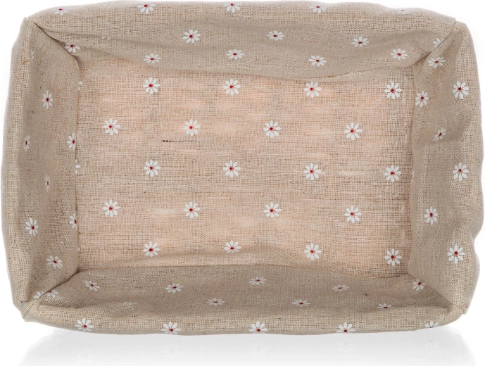 Coșul Daisy combină împletitura tradițională din nuiele cu o căptușeală fină din textil, cu motiv de margarete mici. Datorită aspectului său natural și dantelei discrete, se potrivește frumos în stiluri rustice, country sau scandinave de interior. Este potrivit în special pentru utilizare decorativă – pentru pâine și produse de panificație, fructe, șervețele, produse cosmetice sau mici obiecte de uz casnic.
