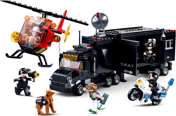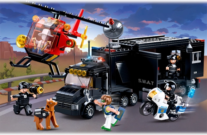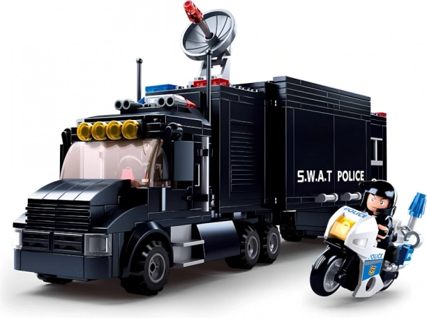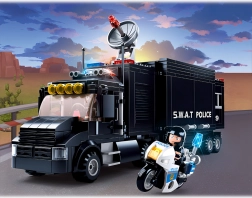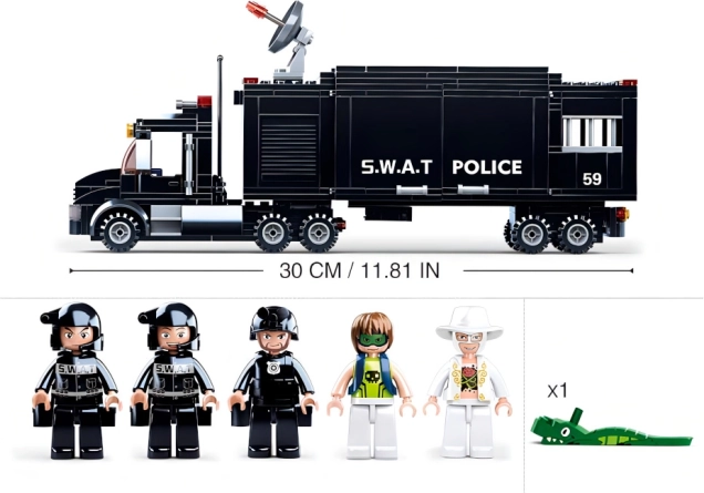 Piesa principală a setului este camionul SWAT negru – o bază mobilă cu detalii realiste, care servește drept centrală pentru toate acțiunile poliției. Ideală pentru deplasări tactice și planificarea intervențiilor.