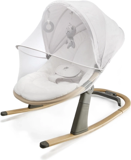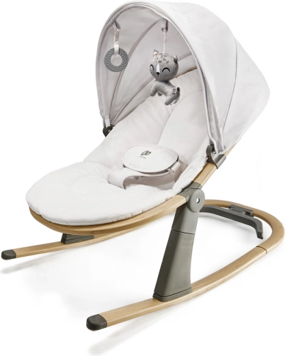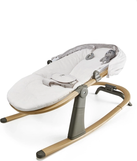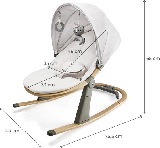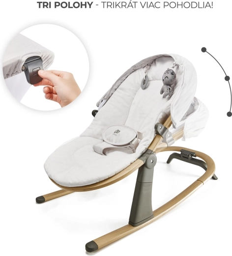 Comutați dintr-o legănare ușoară la un șezlong stabil dintr-o singură mișcare. Trei poziții reglabile ale spătarului asigură susținerea corectă pentru odihnă și joacă, de la naștere până la 9 kg.
