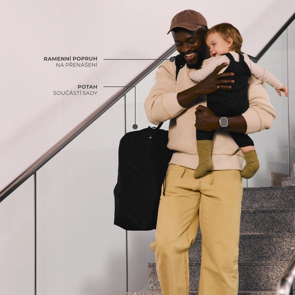 Mecanismul intuitiv permite plierea rapidă într-un pachet compact, care respectă standardele IATA pentru bagajul de cabină. După pliere, căruciorul stă singur în poziție verticală, iar transportul este ușurat de cureaua de umăr integrată.