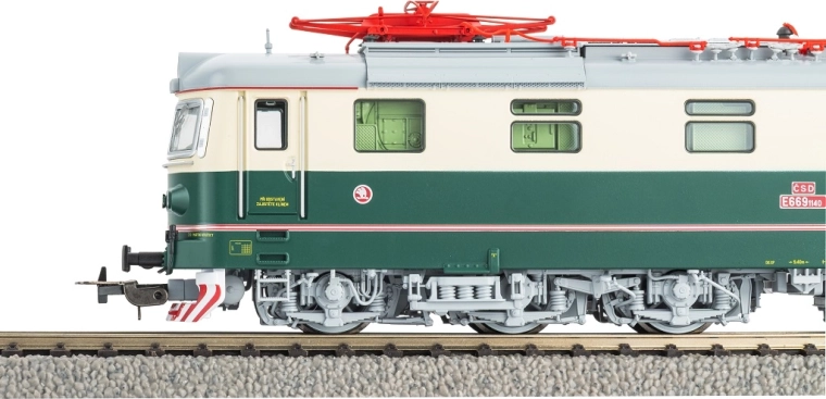 Această locomotivă electrică cu șase osii din seria E 669.1 în schema iconică ČSD redă fidel robustul vehicul de marfă care a dominat transportul greu timp de decenii. Modelul Piko impresionează prin detalii fine ale suprafețelor, boghiuri realiste, inscripționare precisă și două pantografe metalice tip foarfecă. Datorită interfeței NEM 658 PluX22 este pregătit pentru instalarea ușoară a sunetului.