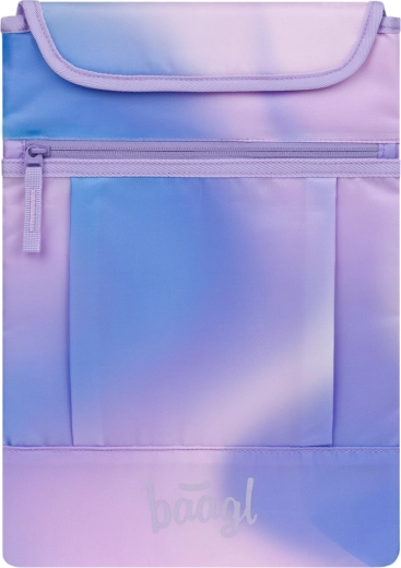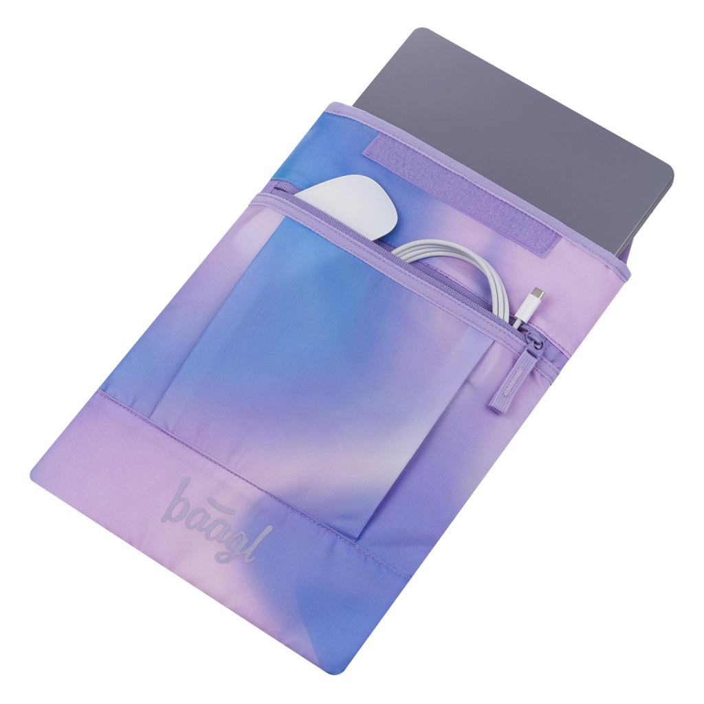 Husă BAAGL Sky pentru laptop, elegantă și rezistentă, pentru dispozitive de până la 15″, care protejează în mod fiabil echipamentul în călătorii și la școală. Are material rezistent la apă, căptușeală moale și un buzunar frontal spațios pentru accesorii cu fermoar YKK. Fabricată din 100% material reciclat cu un gradient pastel modern.