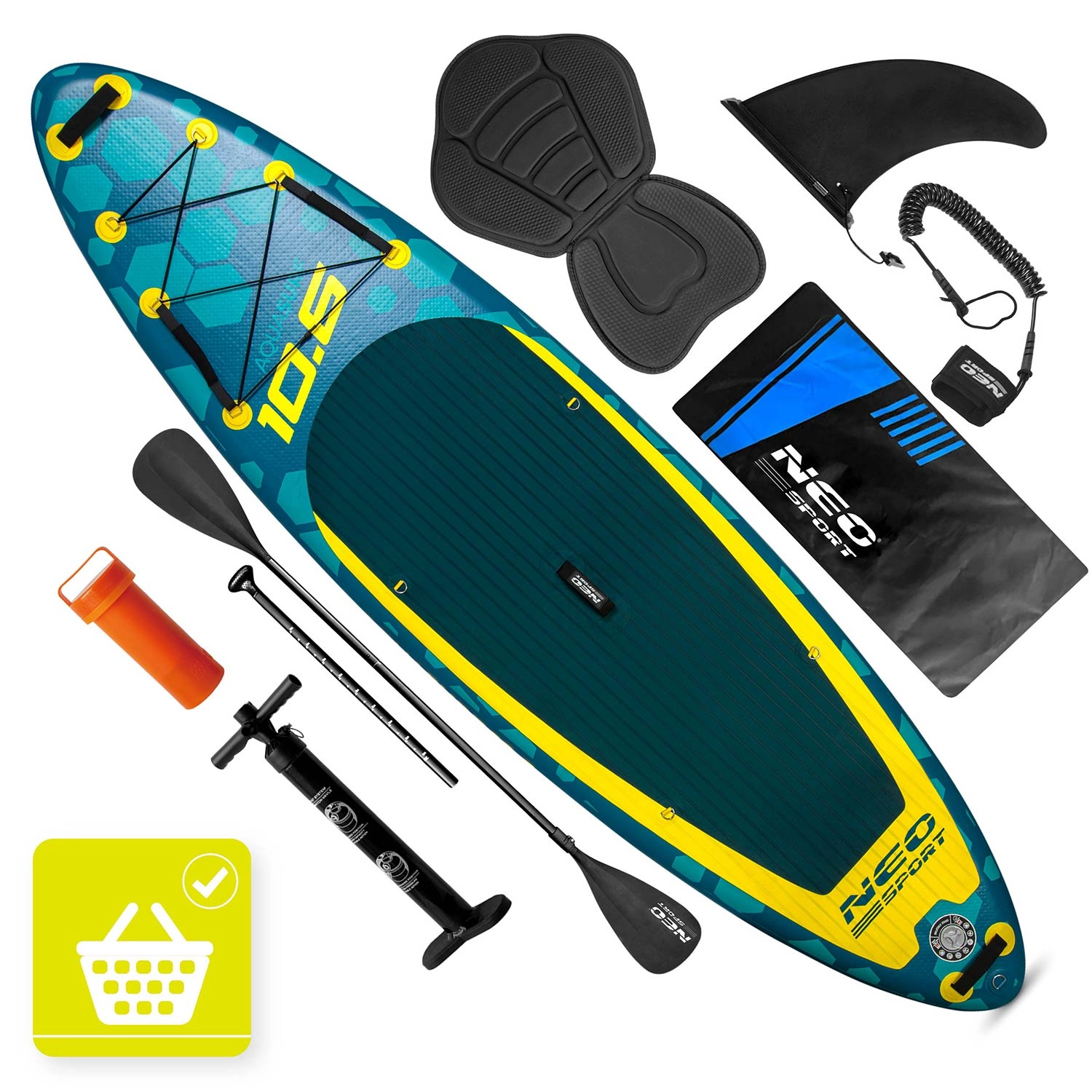 Pachetul include pompa cu dublă acțiune și manometru pentru o umflare rapidă și sigură, pagaia reglabilă din aluminiu (162–210 cm) cu blocare rapidă, leash de siguranță cu articulație rotativă anti-încâlcire, derivă centrală detașabilă, kit de reparații și rucsac de transport din material ranforsat. Cu o capacitate de până la 140 kg, SUP-ul este potrivit pentru rideri de diferite înălțimi și conformații, precum și pentru o încărcătură ușoară.