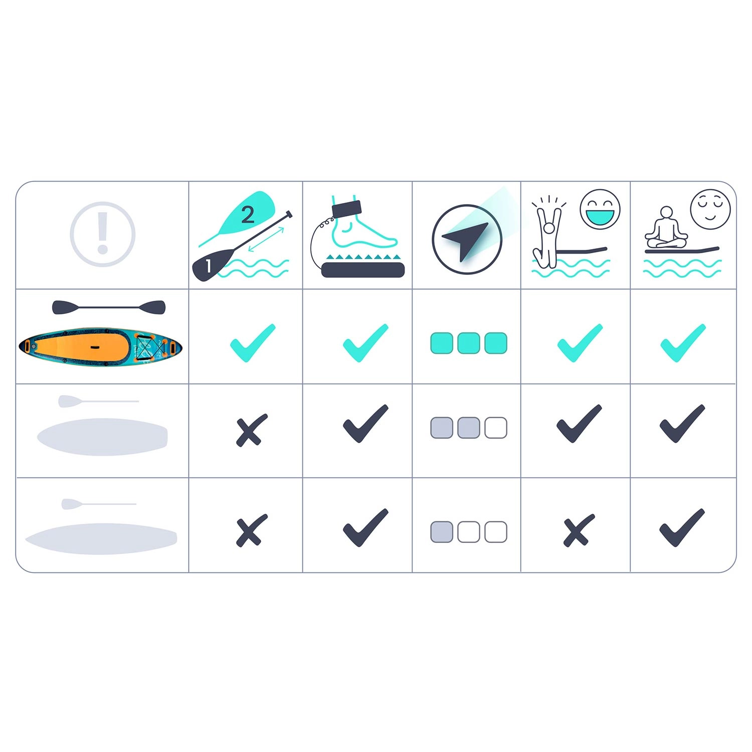 În partea frontală se află o plasă elastică cargo practică pentru rucsac, geacă sau sticlă. Vâsla din aluminiu reglabilă (162–210 cm) se blochează rapid cu un zăvor cu pârghie și se adaptează staturii și stilului de vâslire. Pompa cu dublă acțiune și manometru accelerează umflarea și permite control precis al presiunii. Leash-ul cu articulație pivotantă nu se răsucește și te menține în siguranță. Trei mânere de prindere facilitează transportul către plajă sau mașină.