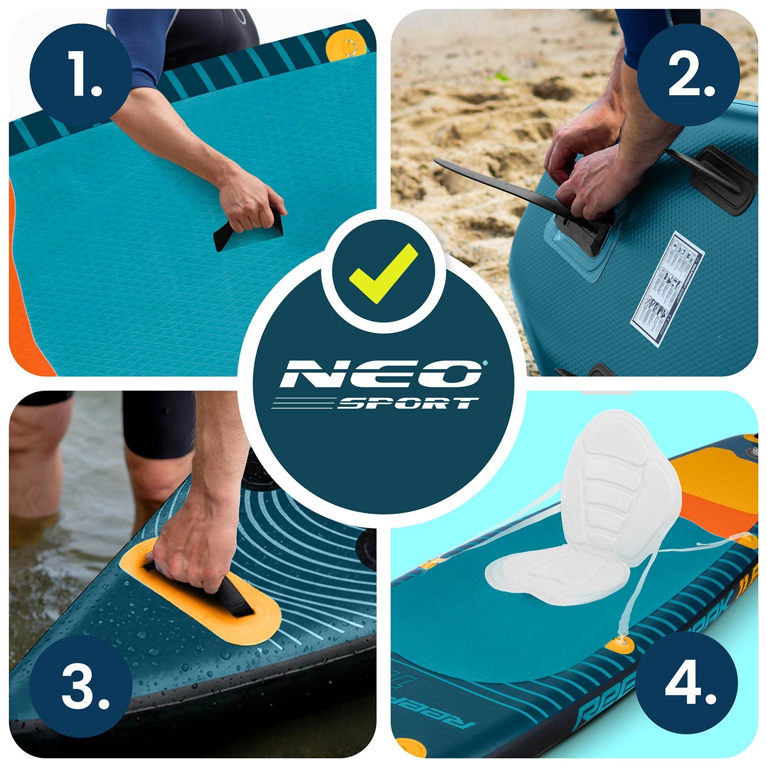 Totul se împachetează în rucsacul de transport rezistent, confortabil de purtat pe spate. Placa are caracteristici excelente de glisare, stabilitate direcțională bună datorită lănii și suportă încărcare până la 150 kg – ideală pentru ture mai lungi, fitness sau relaxare.