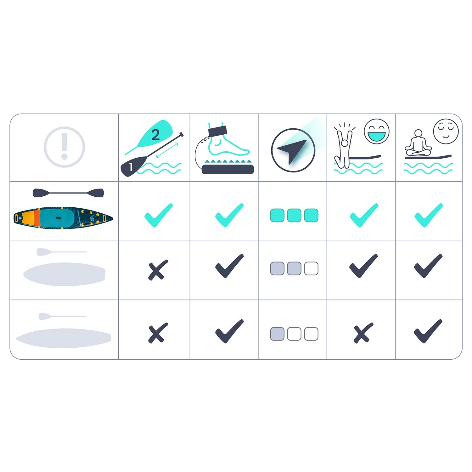Dotările practice includ bungee frontal pentru fixarea rucsacului sau a apei, mâner central și mai multe mânere de transport pentru portabilitate ușoară. Pagaia reglabilă 162–210 cm se blochează rapid cu clemă cu pârghie, în timp ce pompa dublă acțiune cu manometru grăbește pregătirea pe apă. Leash-ul cu articulație pivotantă asigură siguranța fără încâlcire.