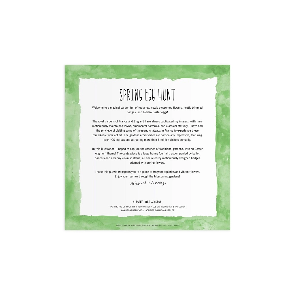 Bucurați-vă de atmosfera unei grădini de primăvară inspirate de parcurile europene, cu o fântână centrală și straturi înflorite. Ilustrația lui Michael Storrings se remarcă prin detalii fine, motive jucăușe și o armonie a culorilor care face ca asamblarea să fie distractivă și, totodată, liniștitoare. Imaginea finală de 50,8 × 50,8 cm va deveni o decorațiune stilată pentru interiorul dumneavoastră.