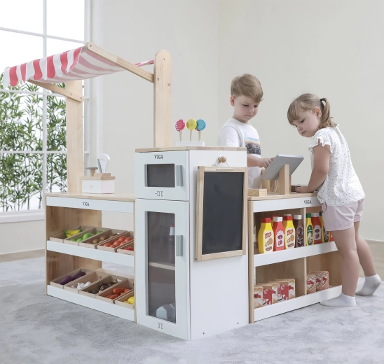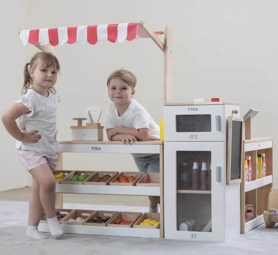 Descoperiți marele stand de supermarket Viga XXL din lemn, care transformă camera copilului într-un supermarket plin de fantezie. Designul realist, cu tejghea, frigider cu congelator, tablă pentru cretă și coșuri de depozitare, stimulează jocul de rol vânzător–client, dezvoltând comunicarea, calculul și colaborarea. Fabricat din lemn sigur cu vopsele netoxice.