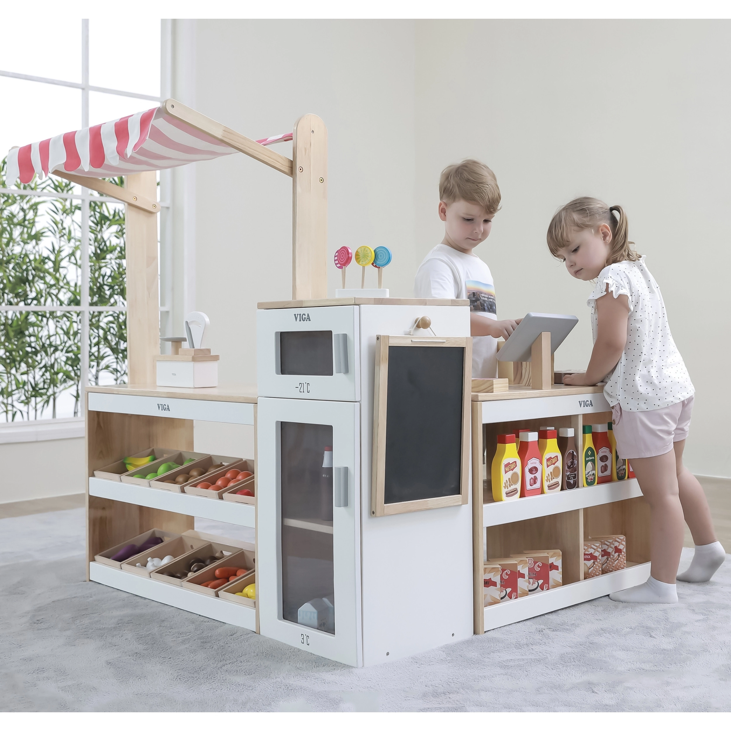 Copiii au la dispoziție o tejghea clar organizată, mai multe coșuri de depozitare și rafturi pentru expunerea „mărfurilor”, ceea ce susține organizarea și jocul natural de-a magazinul.