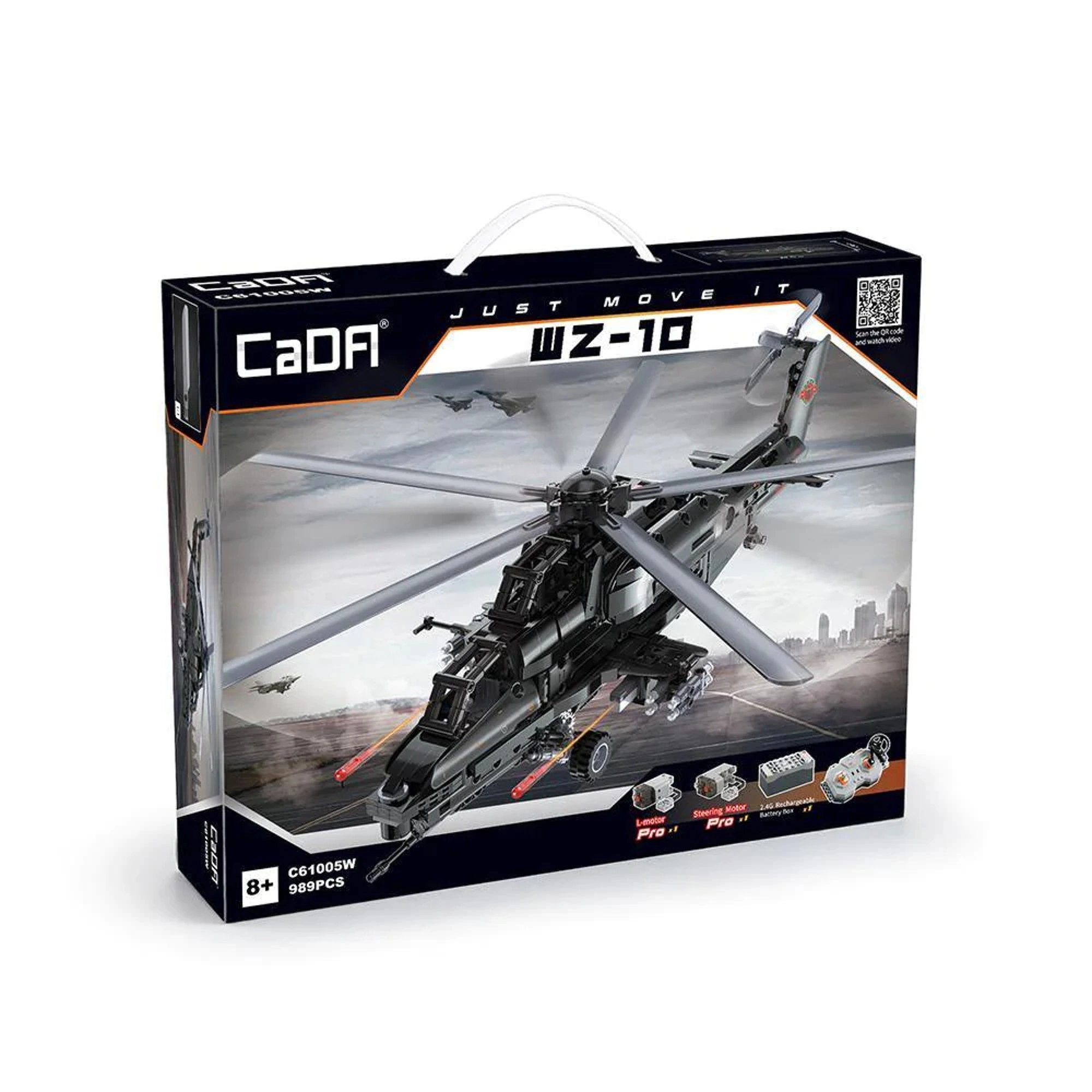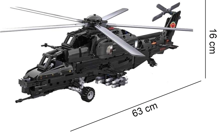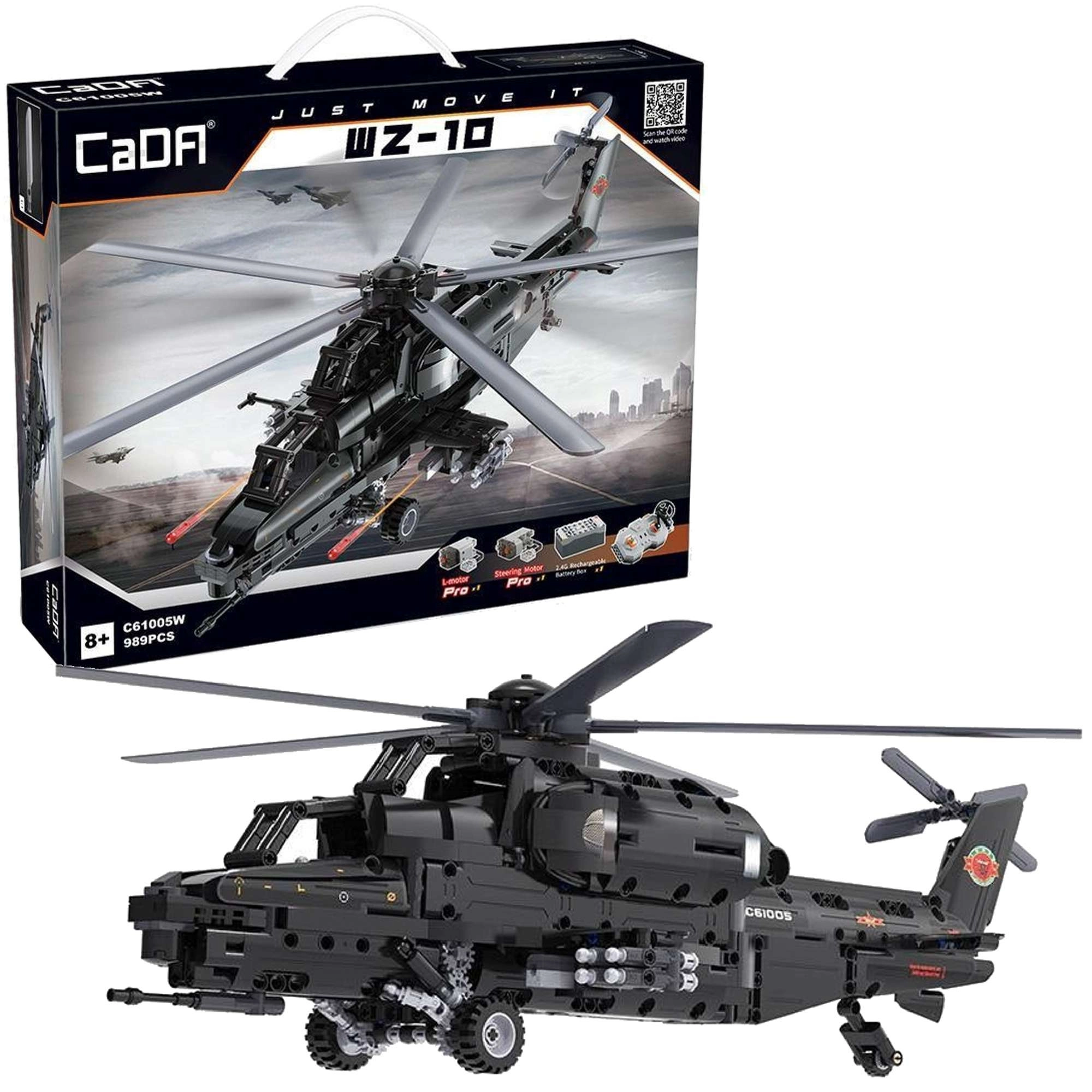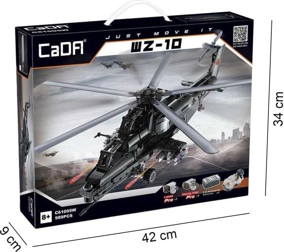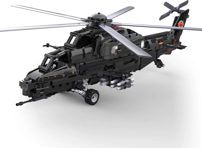 Construiește iconicul elicopter de atac WZ-10 din 989 piese de la CaDA și controlează-l de la distanță. Modelul oferă rotor principal și de coadă funcționale, cockpit care se deschide, lansator de rachete funcțional și deplasare pe roți. Datorită controlului RC de 2,4 GHz cu rază de peste 25 m, te vei bucura de multă distracție plină de acțiune și de o construcție tehnică precisă.