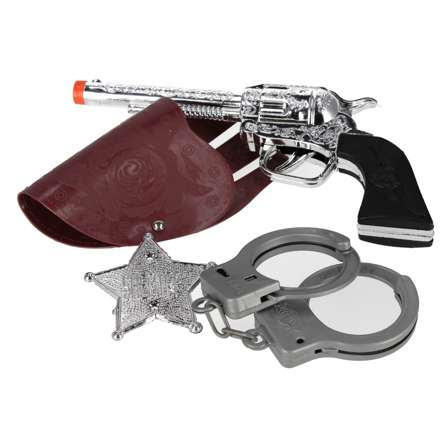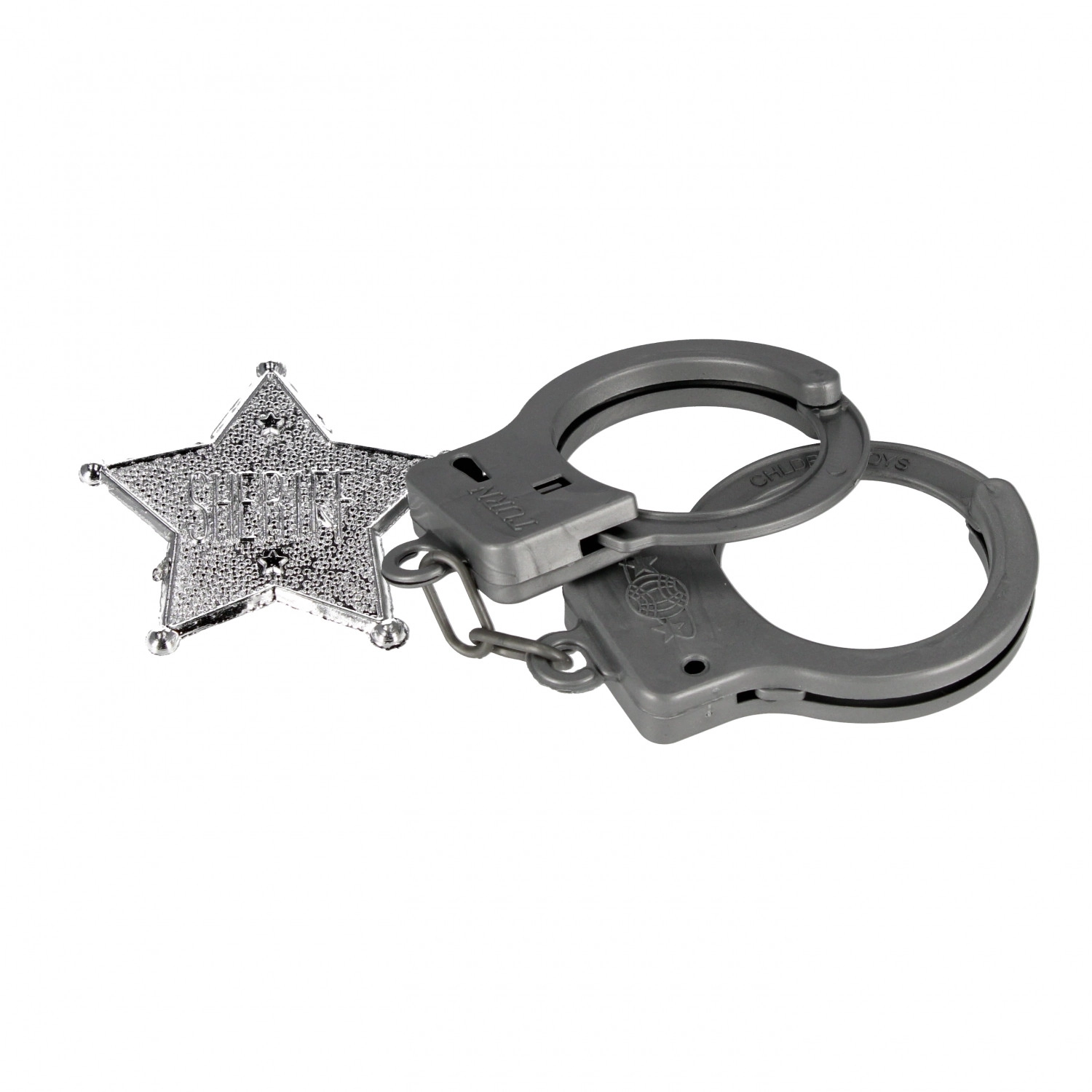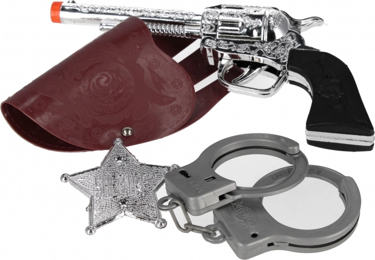 - Set complet: armă de jucărie, insignă de șerif și cătușe
