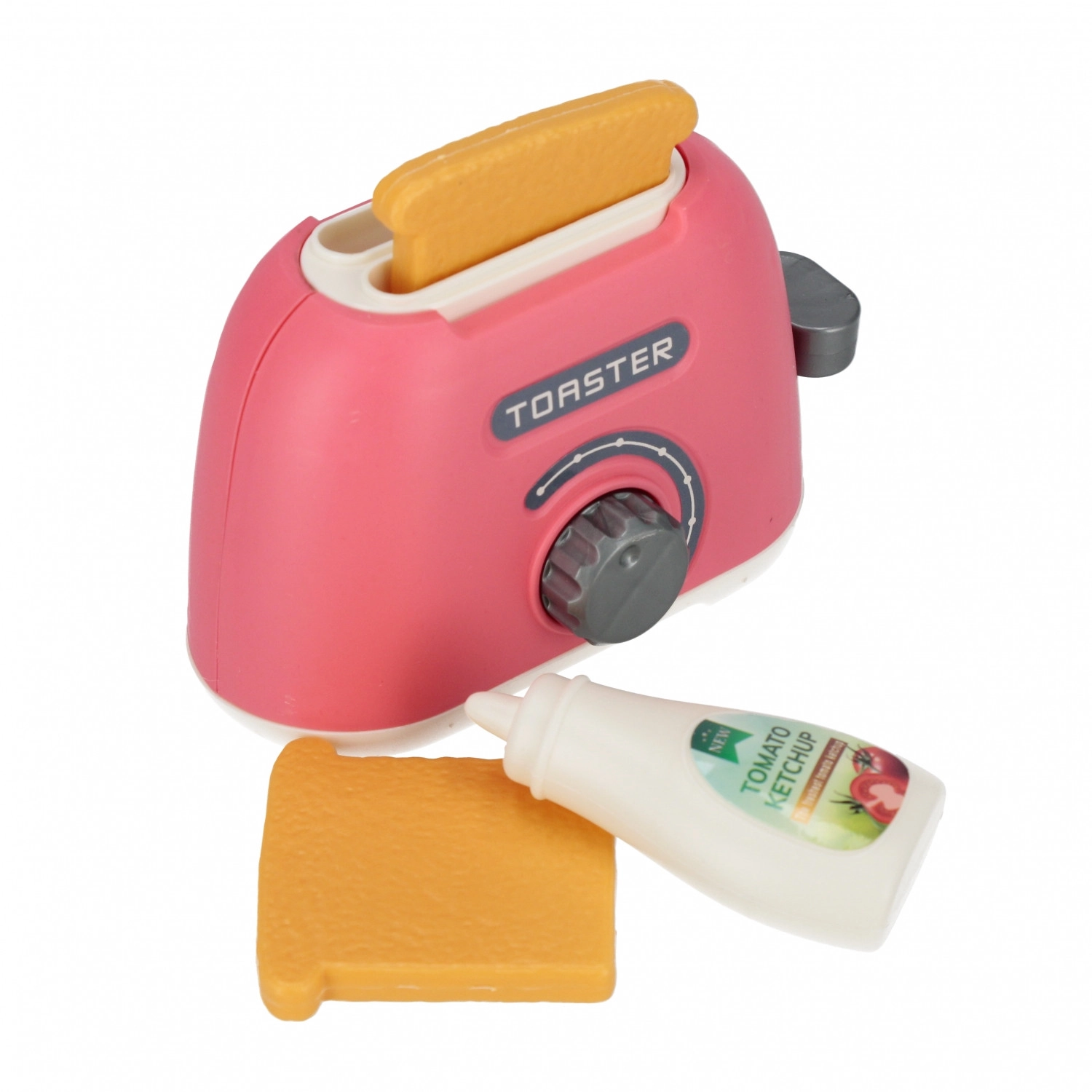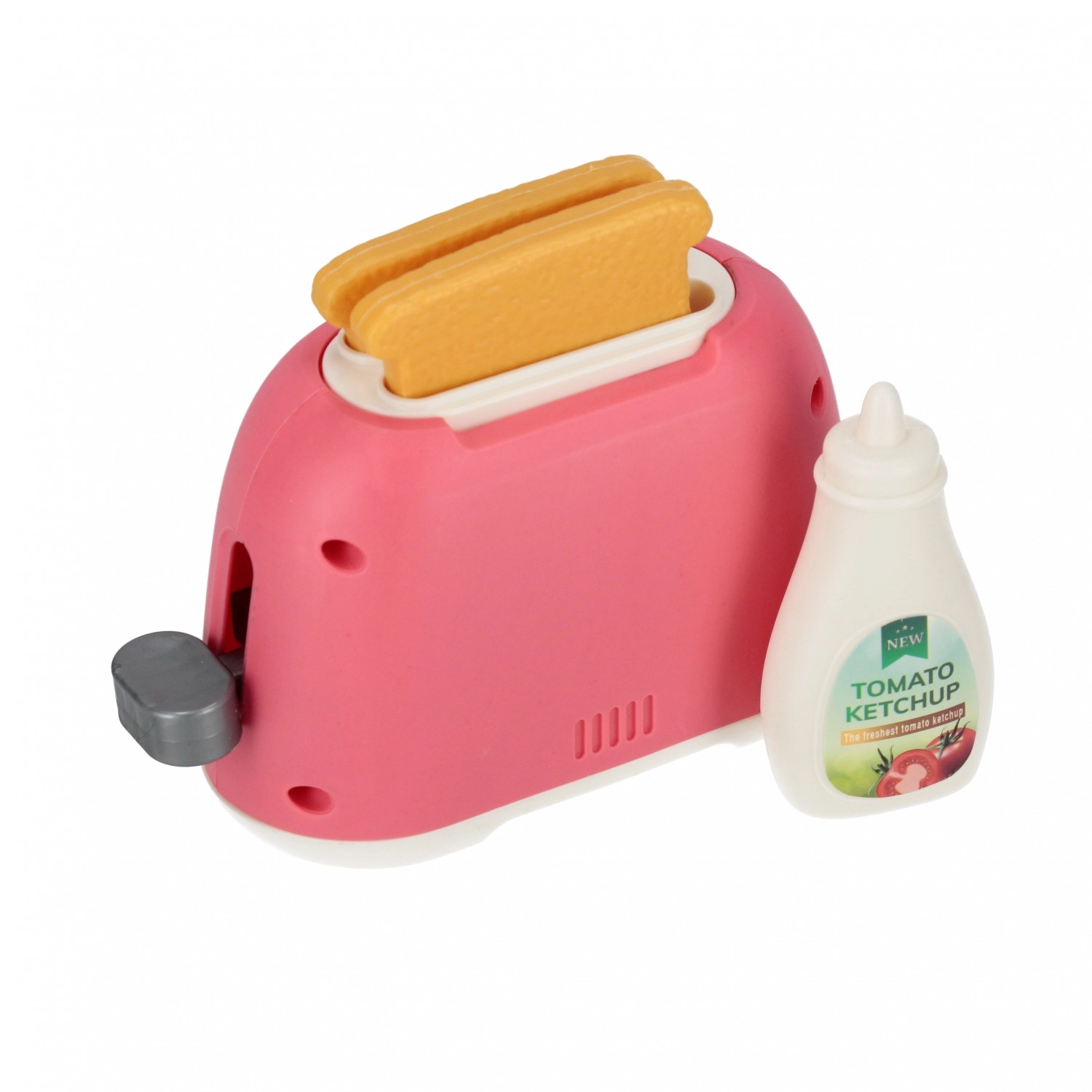 Un mic prăjitor roz, cu manetă și cadran rotativ pentru setarea „rumenirii”, excelent pentru joaca de-a bucătarul. Include 2 felii de toast și o sticlă de ketchup.