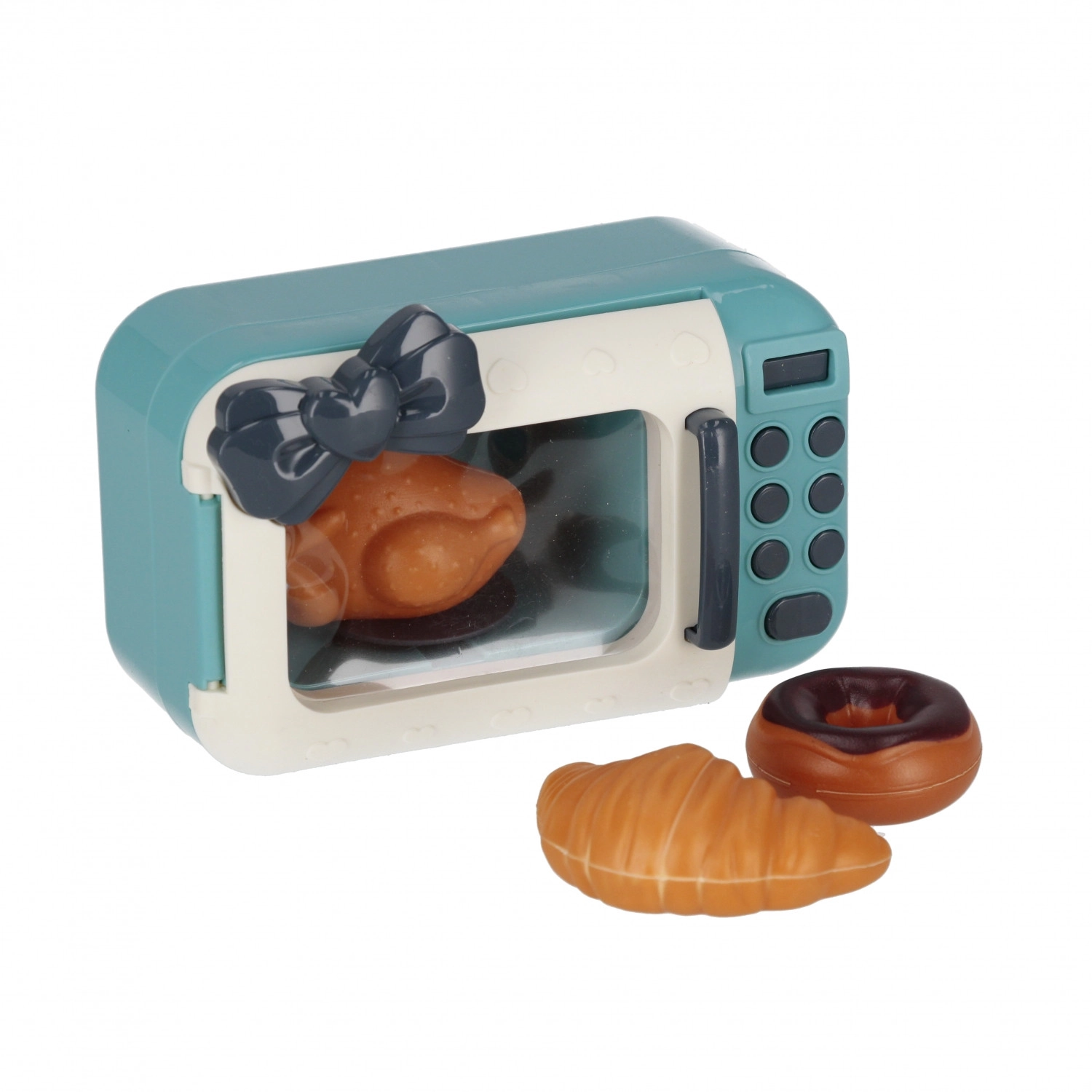 Un cuptor cu microunde drăguț, cu uși transparente și butoane. Copiii pot „încălzi” puiul, croissantul și desertul dulce.