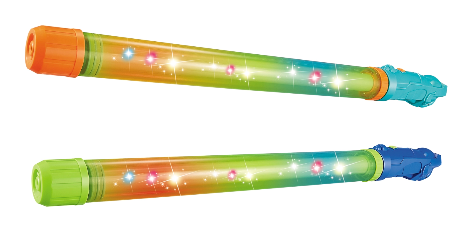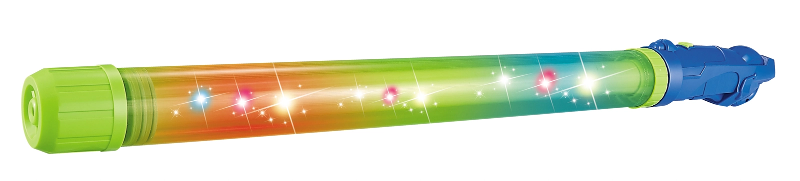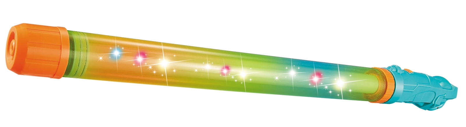 La apăsarea butonului, corpul transparent al pistolului se aprinde în culori. Copiii se pot bucura de acțiune chiar și în condiții de iluminare slabă.