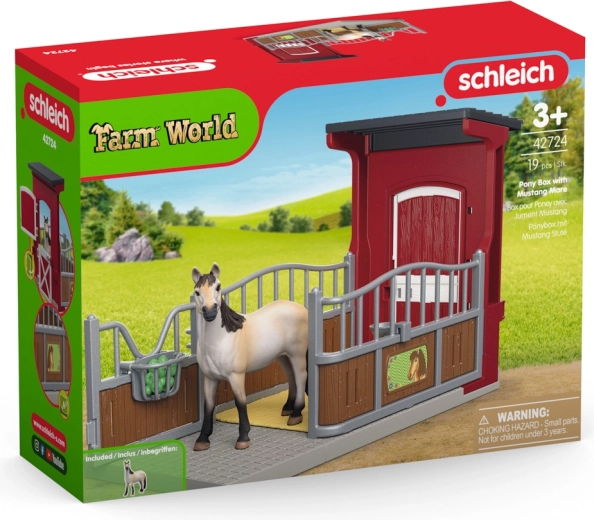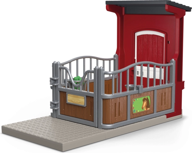 Boxul roșu, stilat, oferă iepei mustang un adăpost primitor după o zi lungă. Include podea cu paie, jgheab metalic pentru hrană cu mere verzi și un bol cu apă. Ușile se deschid pentru a plasa ușor calul și pentru scenarii de joc. Plăcuța frontală poate fi completată cu propriul nume – alege-l pe al tău!