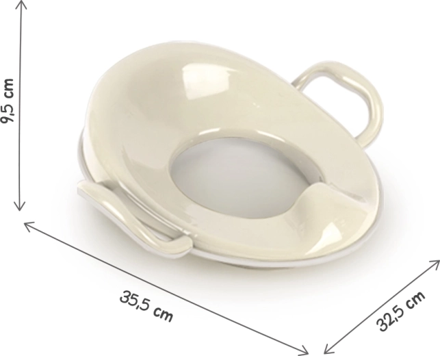 Scaunul pentru toaletă pentru copii, în culoare bej, facilitează trecerea la toaleta clasică. Oferă formă ergonomică, suprafață anti-alunecare și mânere laterale pentru stabilitate și siguranță maxime. Este ușor și ușor de transportat, potrivit și pentru călătorii, și susține postura corectă a corpului în timpul antrenamentului la toaletă.