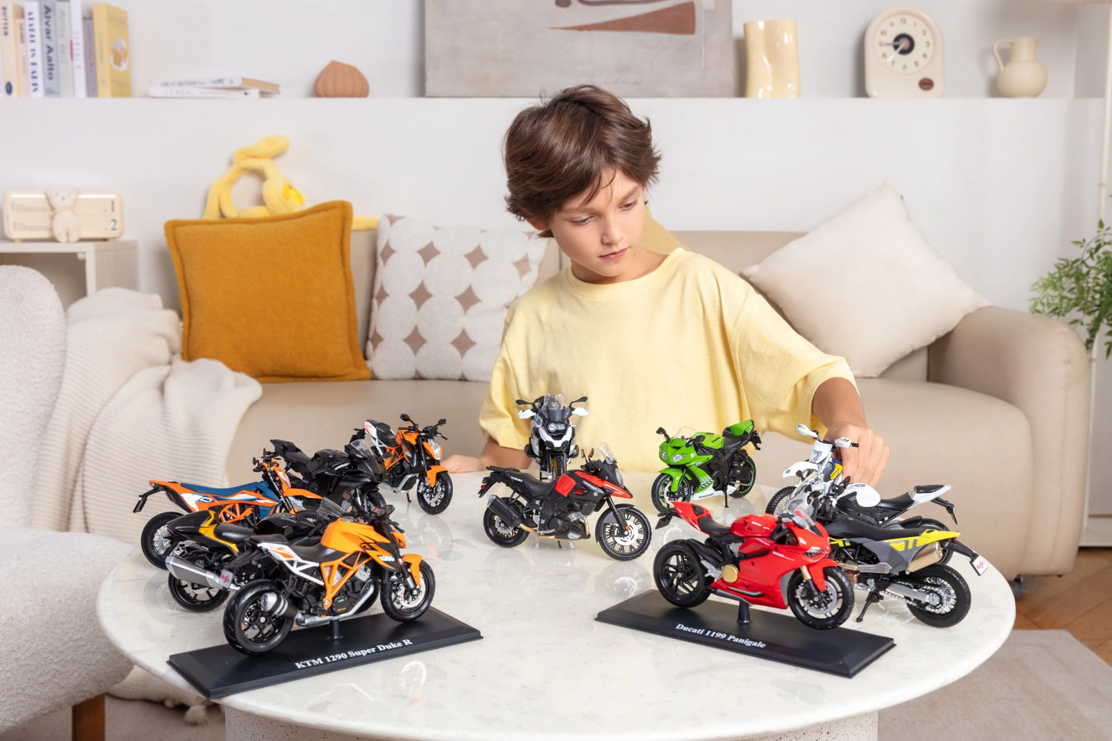 Cadru metalic cu accesorii din plastic, vopsire precisă și elemente fidele – de la spițele roților la discurile de frână – pentru un aspect autentic pe raft și în timpul jocului.