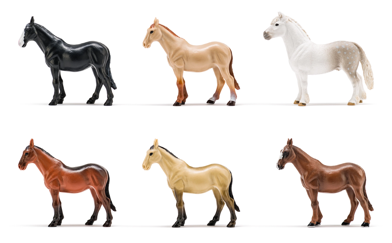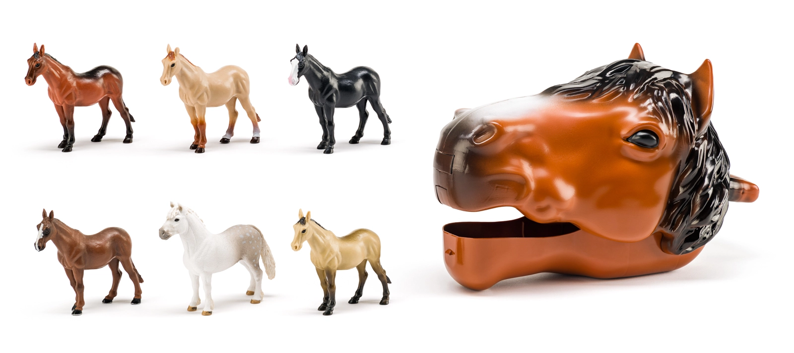 În interior găsești 6 căluți fin modelați în culori variate, inclusiv calul ahaltekin și roibul-țintat. Ambalat într-un open box cu imprimare interioară de pășune, care servește ca decor de joacă sau piesă de expunere originală. Fabricat din plastic de calitate, rezistent pentru distracție de lungă durată.