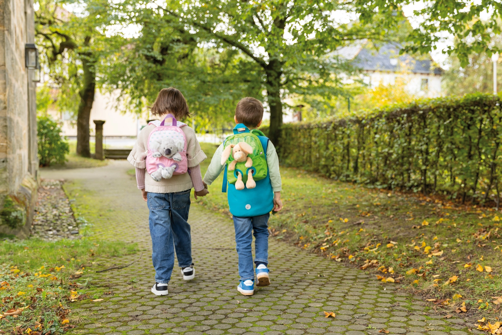 Rucsacul drăgălaș pentru copii NICI, în design verde cu motiv de frunzulițe, îmbină utilitatea pentru purtare zilnică cu o jucărie de pluș jucăușă. Iepurașul moale de 25 cm este prins în buzunarul frontal cu elastic, dar poate fi scos ușor pentru joacă. Rucsăcelul oferă bretele căptușite și reglabile, spate moale și compartiment principal cu fermoar pentru depozitarea în siguranță a mărunțișurilor. Un partener grozav pentru grădiniță, excursii și vizite la bunici.
