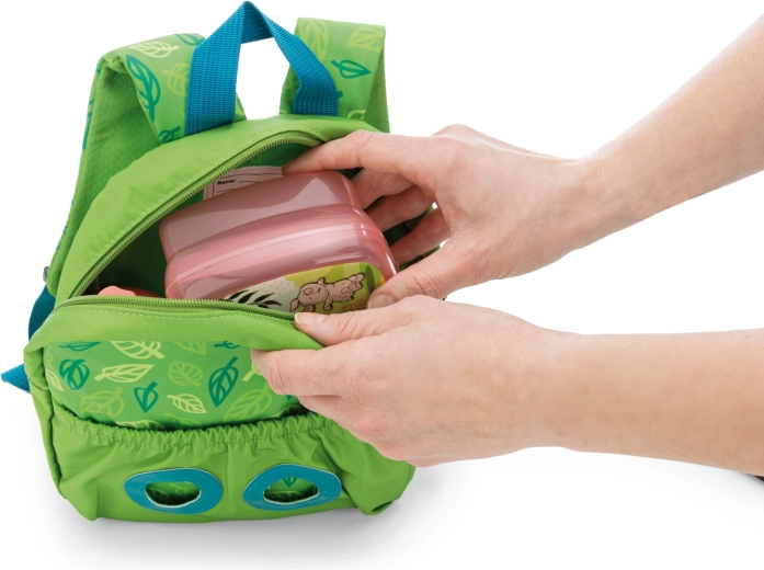 Compartimentul principal cu fermoar poate găzdui gustarea, sticla și jucării mici. Buzunarul frontal cu elastic ține plușul în siguranță la locul lui.
