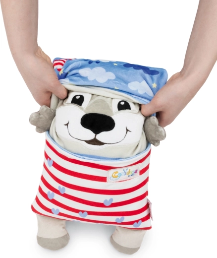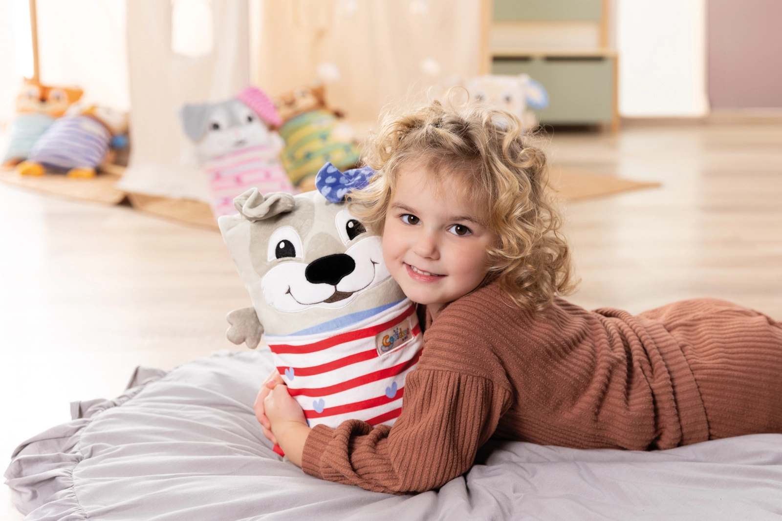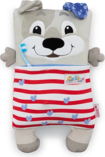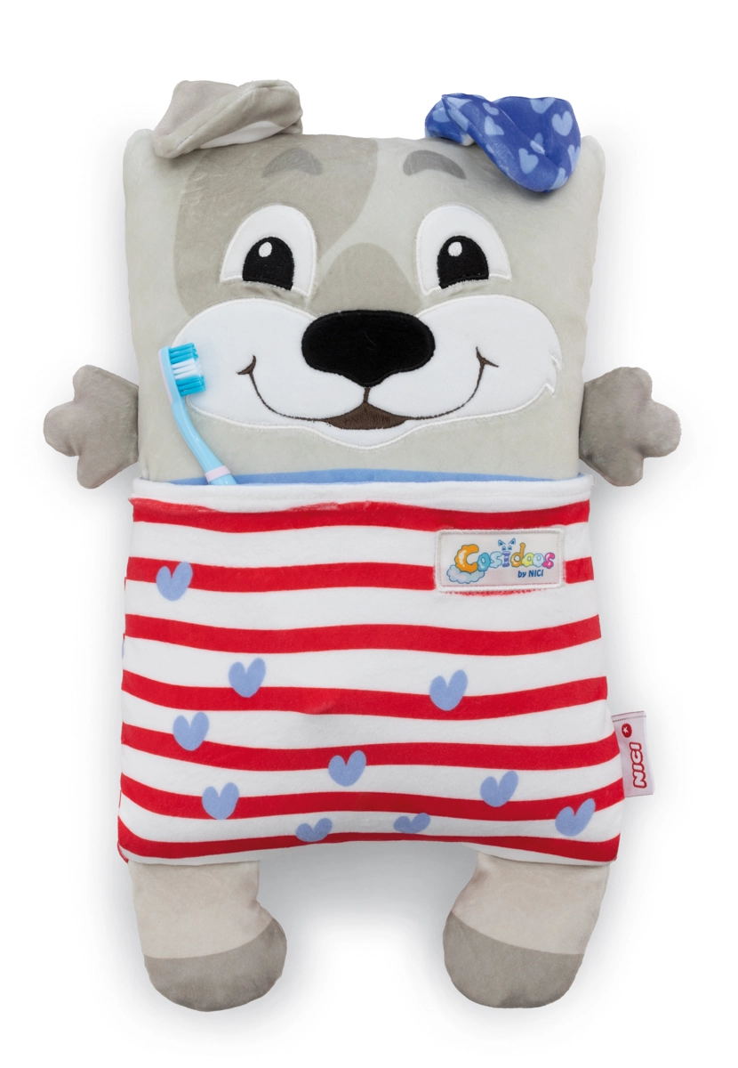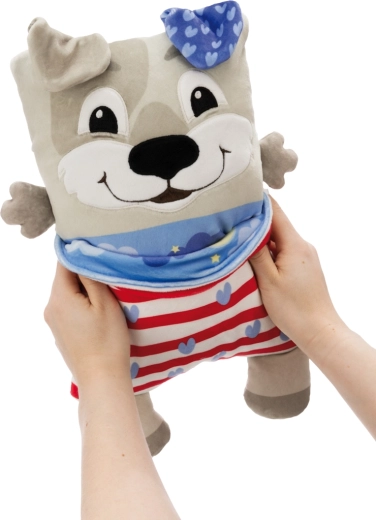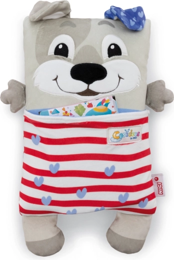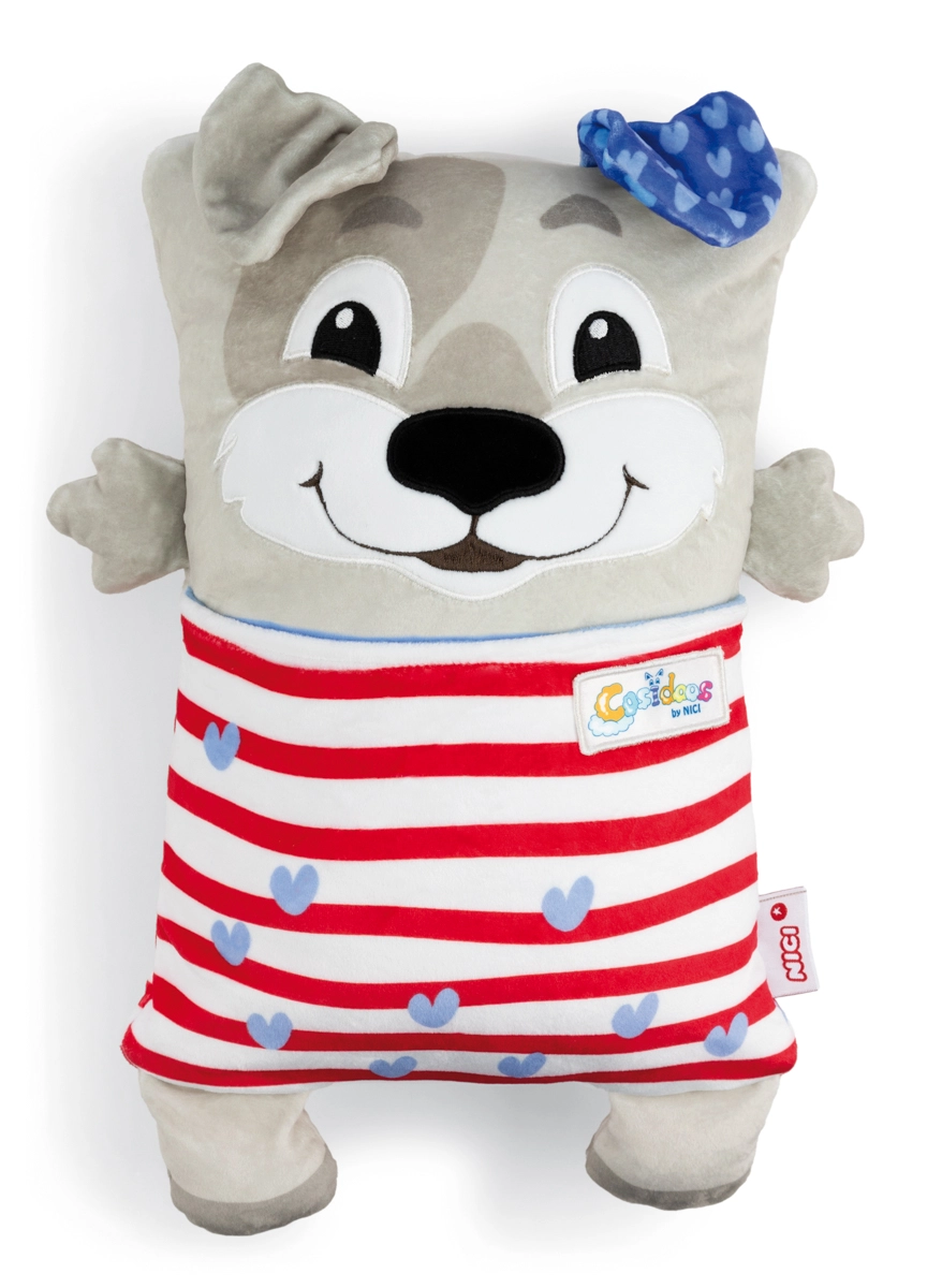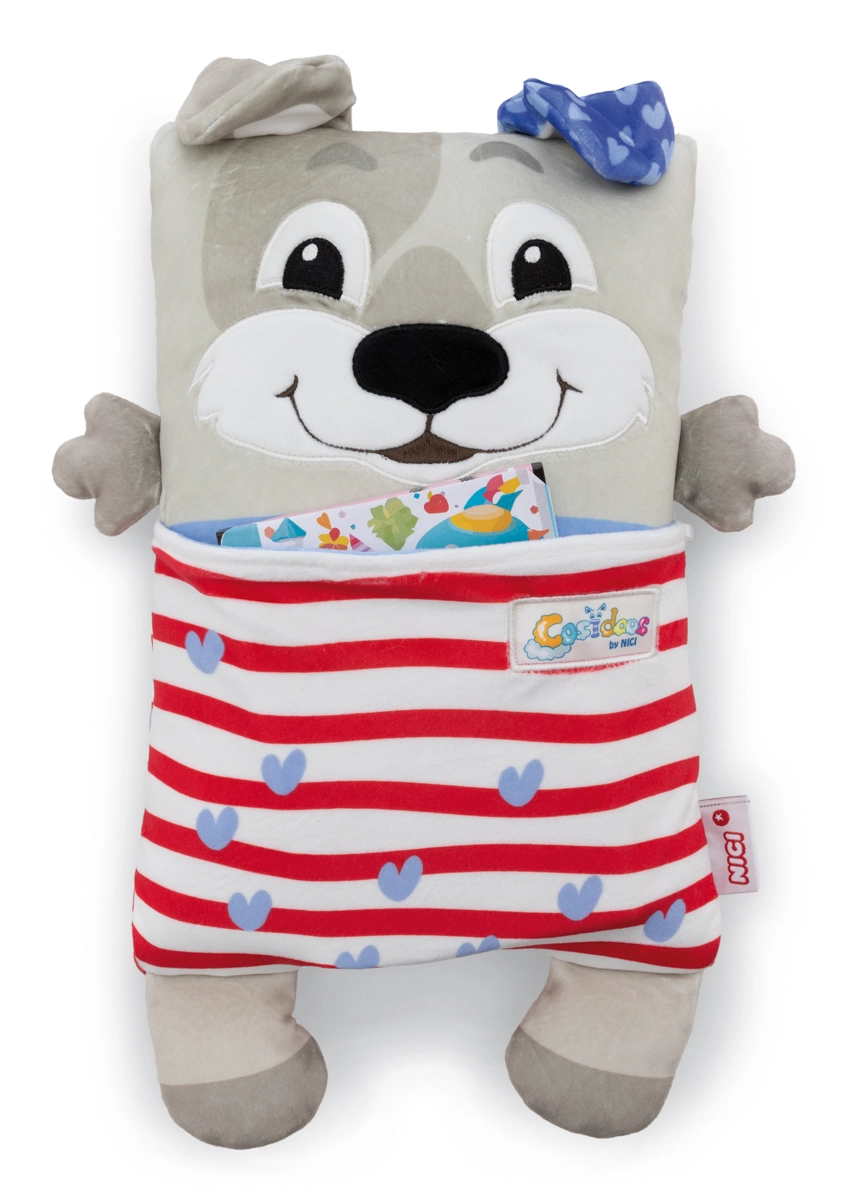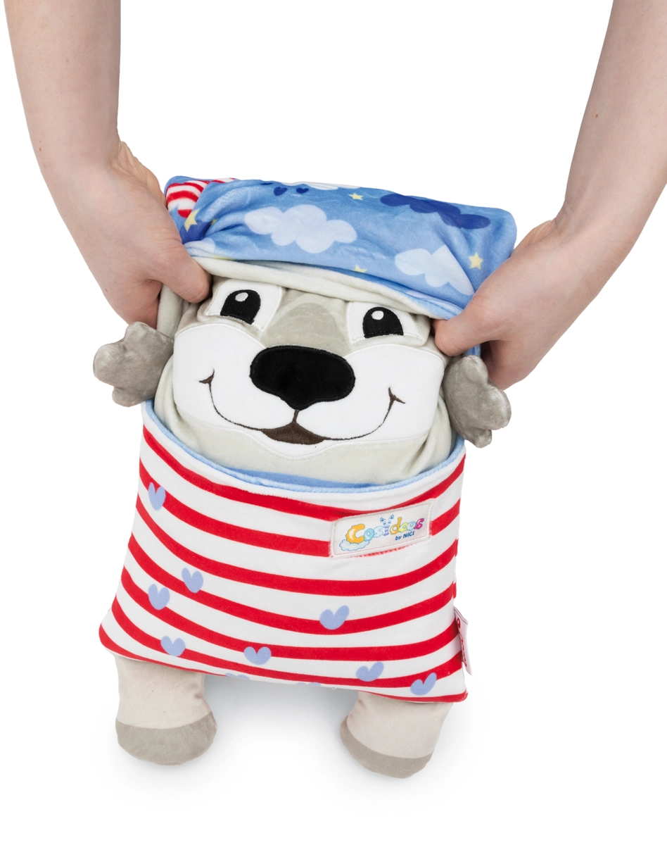 Descoperă farmecul trecerii line între joacă și odihnă. NICI Cosidoos este un cățel fin, cu corp gri și ureche albastră, care printr-o singură răsturnare se transformă din companion jucăuș într-o pernuță pufoasă cu motiv de noapte. Copiii vor îndrăgi expresia lui drăguță, materialele delicate și culorile liniștitoare cu norișori, stele și lună.