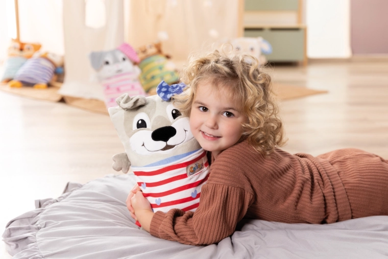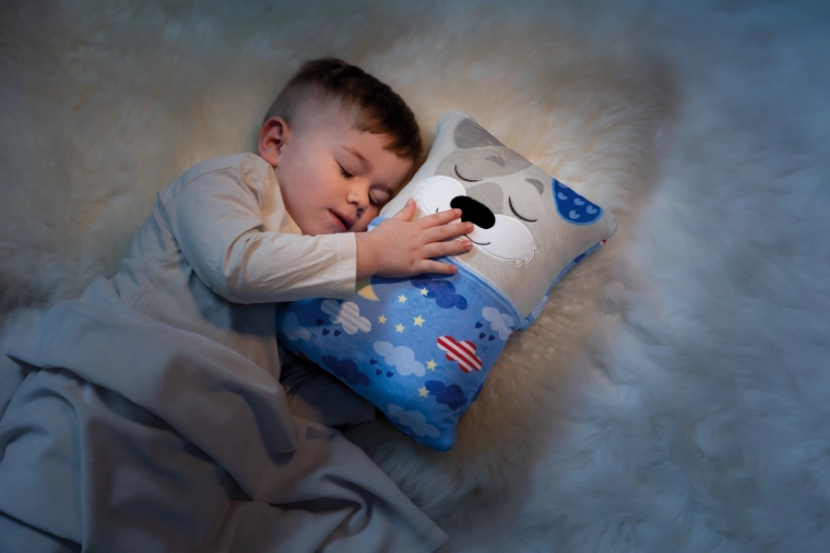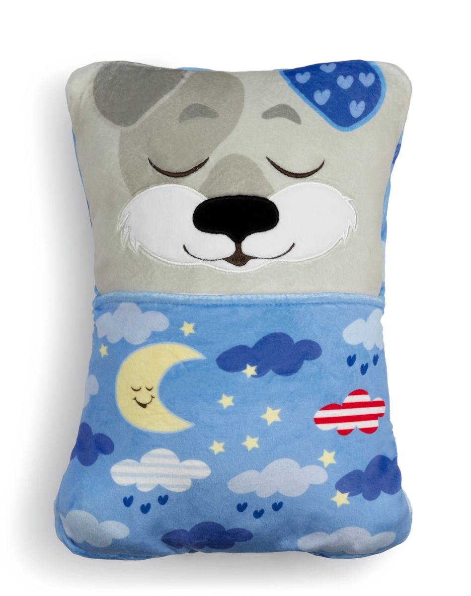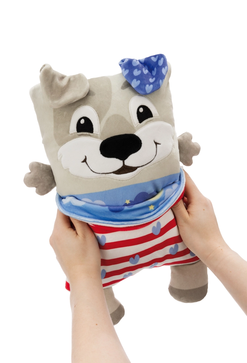Printr-o singură răsturnare, transformi cățelul vesel într-o pernuță de noapte liniștitoare cu norișori, stele și lună. Ritual perfect pentru o adormire mai ușoară.