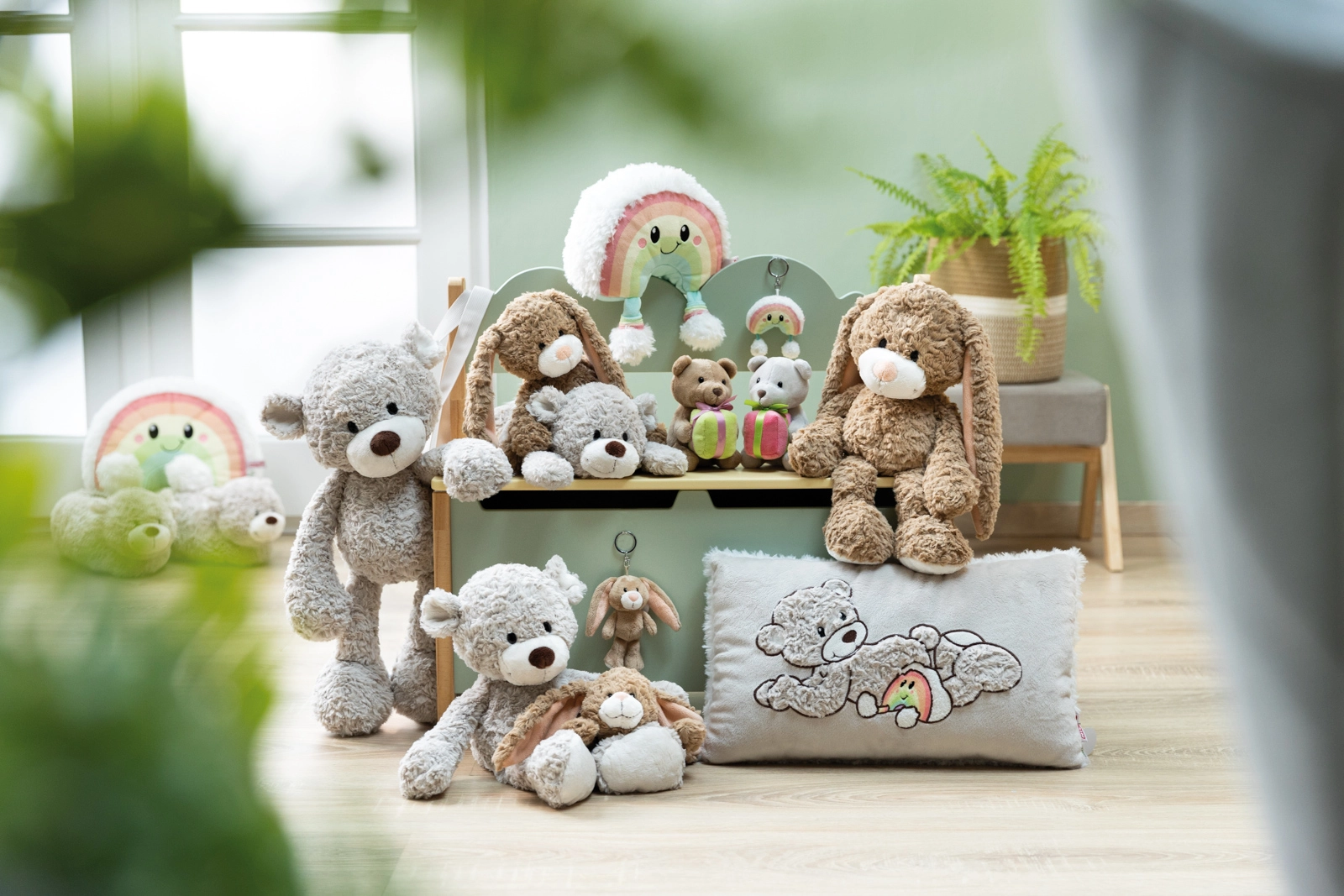 Iepuraș bej deschis, cu urechi lungi, plăcut la atingere și atrăgător de la prima vedere – perfect ca dar sau mic răsfăț personal.
