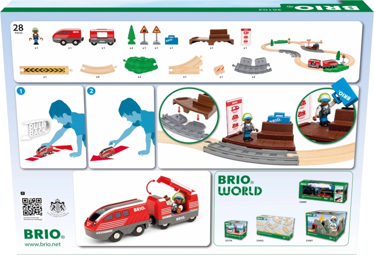 Include 28 de piese: trenuleț roșu cu arc, vagon pentru pasageri, figurina, peron, șine din lemn și șine scenice, copaci, semnalizare rutieră și alte accesorii. Cuplele magnetice clasice BRIO asigură compatibilitatea cu BRIO World și cu majoritatea căilor ferate din lemn.