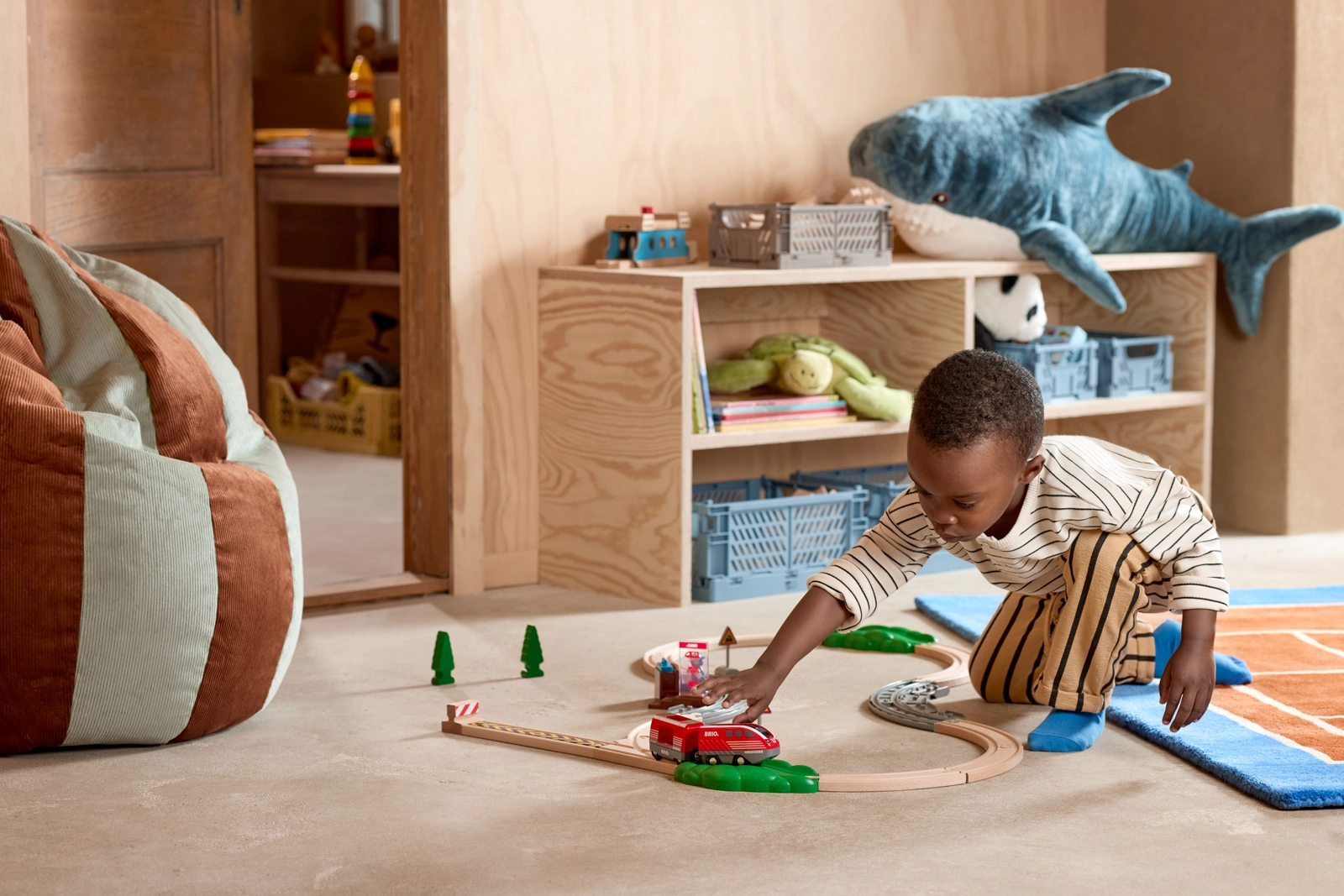 Șine curbate și drepte, pod, peron, semnalizare și copaci le permit copiilor să creeze trasee variate și să-și dezvolte imaginația.