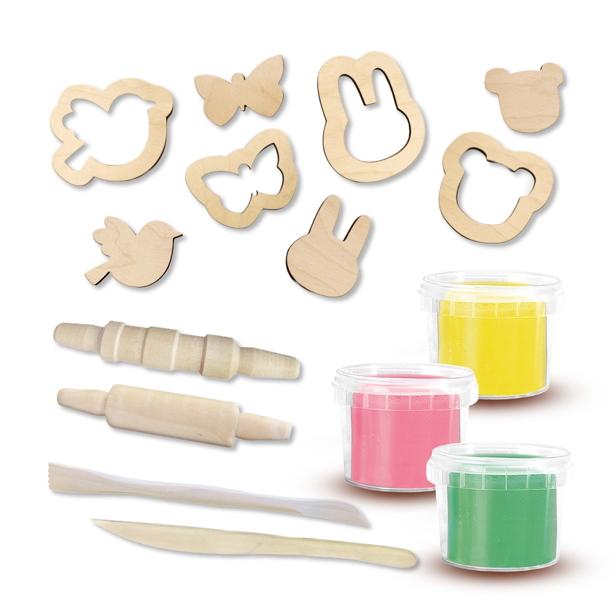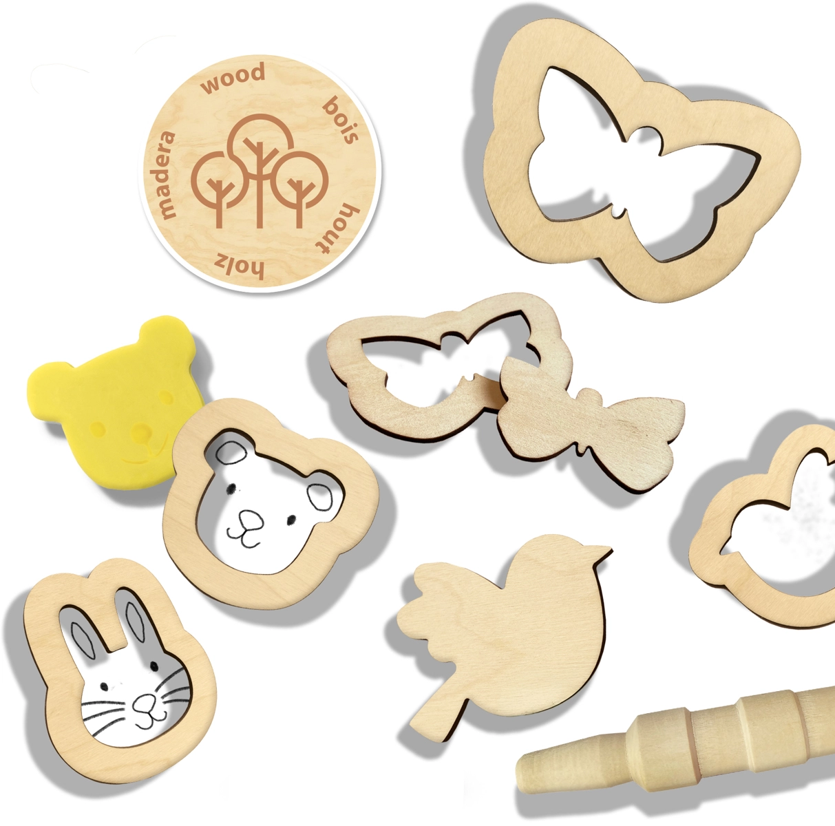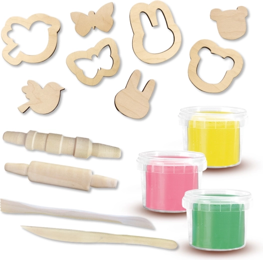 - Accesorii bogate: 2 role din lemn (netedă și cu striații), 2 cuțite din lemn pentru modelaj (plat și cu striații), 4 forme decupatoare și 4 forme tip ștanță.