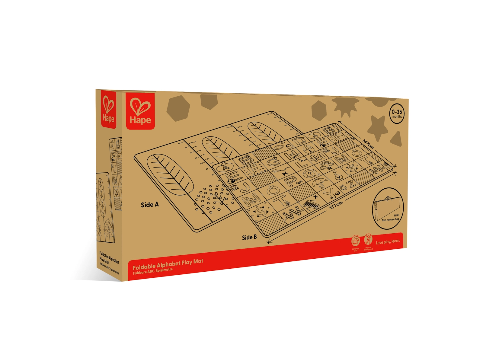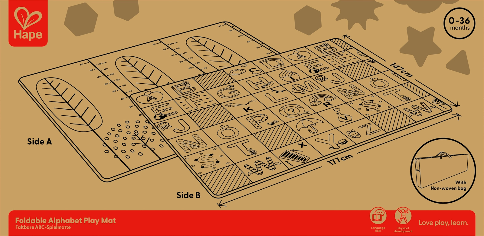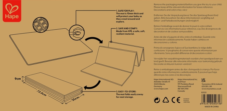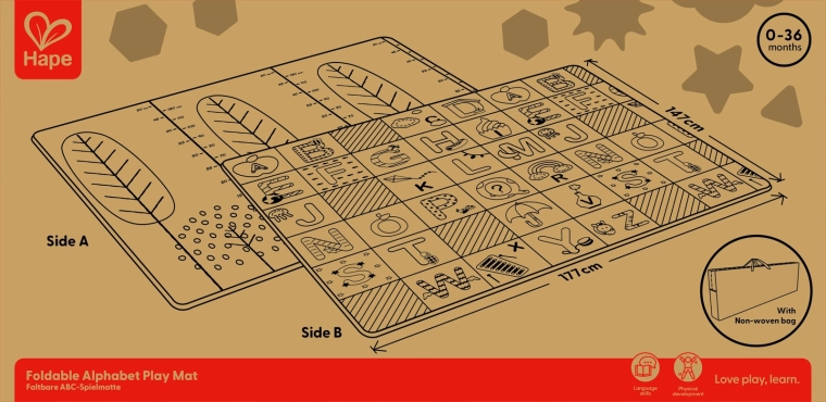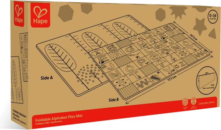 Acest covoraș pliabil HAPE oferă copiilor un loc sigur și confortabil pentru primele descoperiri ale lumii. Dimensiunile generoase de 147 × 177 × 1 cm asigură spațiu suficient pentru joacă, în timp ce designul reversibil combină alfabetul educativ cu o scară practică de înălțime pentru urmărirea distractivă a creșterii.