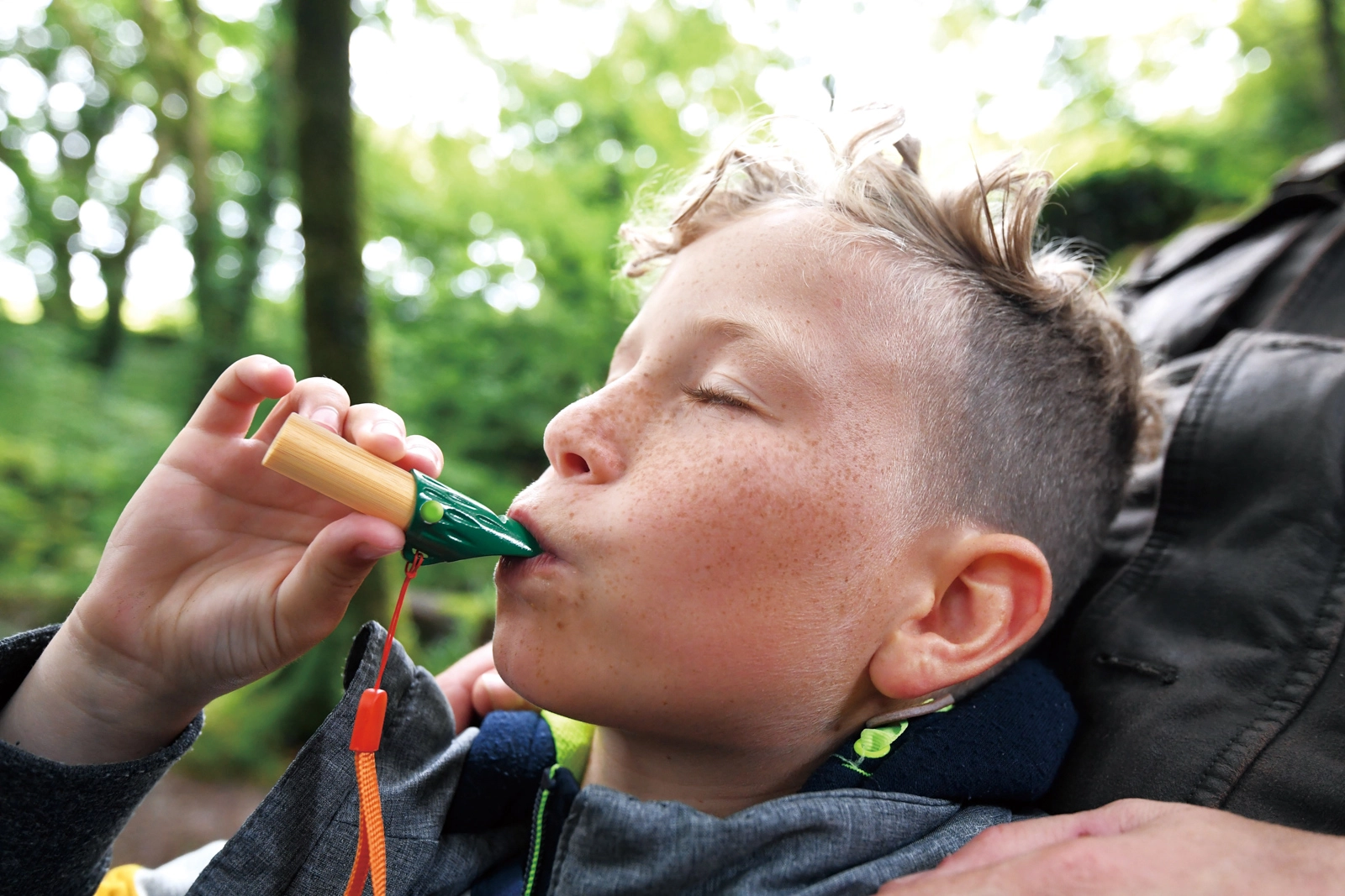 Fluierul practic pentru semnalizare și tubul de observare/compasul compact susțin orientarea în teren și cooperarea de echipă în timpul aventurilor.