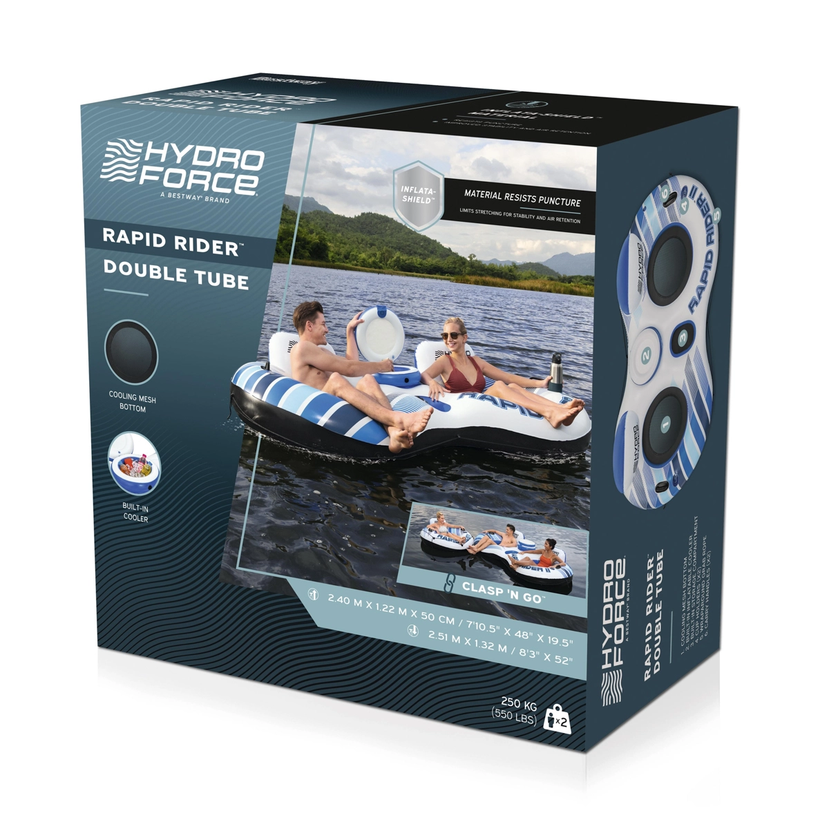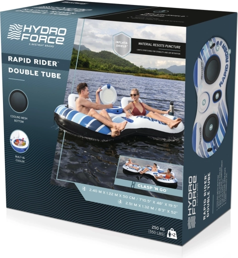 Bucurați-vă de relaxare fără griji pe apă în fotoliul gonflabil dublu HYDRO-FORCE RAPID RIDER II. Oferă șezuturi din plasă pentru o răcorire plăcută, stabilitate ridicată datorită mai multor camere de aer și suporturi integrate pentru băuturi. Practicul răcitor și spațiul de depozitare păstrează lucrurile la îndemână, în timp ce mânerele solide, cordonul de siguranță și sistemul Clasp ’N Go™ asigură o cuplare comodă cu alte ambarcațiuni. Stratului de suprafață Color Shield™ protejează culorile împotriva decolorării.