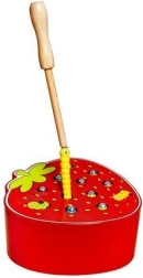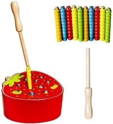 Prinde viermișorul! Acest joc drăguț din lemn, în forma unei căpșuni, îi va distra pe copii mult timp. Cu bagheta magnetică scot viermișorii din orificii și îi introduc la loc, exersându-și astfel motricitatea fină, precizia și concentrarea. Proprietățile naturale ale lemnului sunt completate de o execuție durabilă și de muchii netede și sigure.