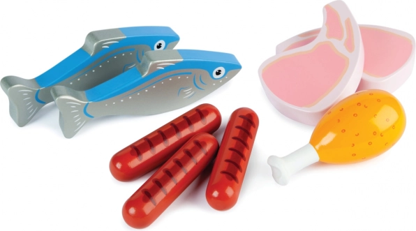 Livrare proaspătă de carne și pește într-o cutie din lemn cu mânere. Jucărie grozavă pentru jocul de-a comercianții sau bucătarii; setul conține 2 pești, 2 cotlete, 3 cârnați și 1 pulpe de pui. O modalitate excelentă de a-i învăța pe copii despre importanța unei alimentații sănătoase și echilibrate, despre originea alimentelor și modul de preparare. Fiecare piesă este robustă și ideală pentru mâinile mici ale copiilor. Susține jocul creativ și imaginativ. Fabricat din materiale de calitate, provenite din surse responsabile. Conform cu standardele europene de siguranță. Principalele caracteristici: formă ideală pentru mâinile mici ale copiilor, stimulează creativitatea și imaginația