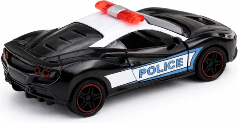 Modelul sport de poliție în combinație alb-negru, cu inscripții vizibile POLICE și rampă luminoasă pe acoperiș, impresionează prin designul modern și execuția de calitate. Caroseria metalică, în combinație cu plastic rezistent, prelungește durata de viață a jucăriei și îi crește stabilitatea în timpul mersului.