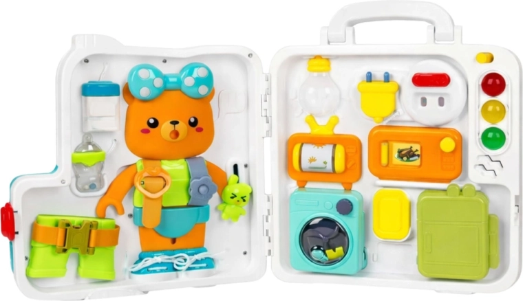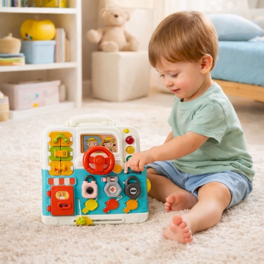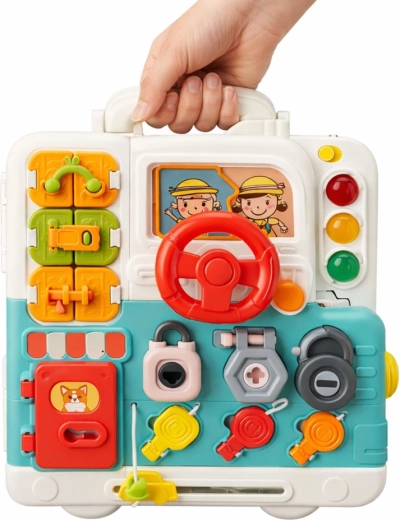 Tablă interactivă portabilă, în formă de valiză pliabilă, care dezvoltă motricitatea, gândirea logică și simțurile copiilor. Cei mici se joacă cu rotițe, încuietori și chei, comutatoare, ușițe și imită activitățile de zi cu zi. Efectele luminoase și sonore mențin atenția și susțin coordonarea mână–ochi și explorarea independentă.