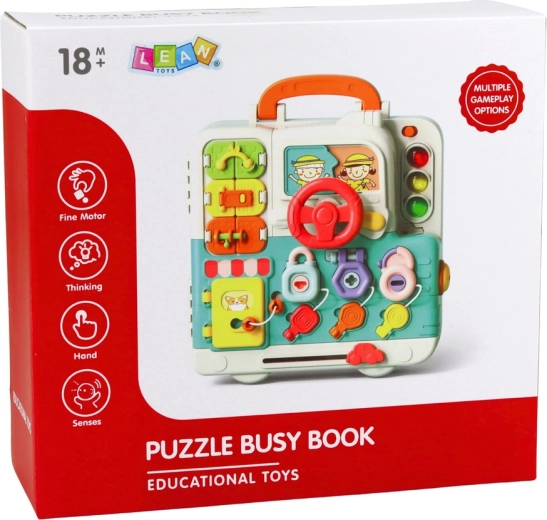 Această tablă/carte interactivă este concepută ca o valiză compactă cu mâner, astfel încât o puteți lua ușor acasă sau în călătorii. Odată deschisă, oferă o suprafață mare de joacă și acces simultan la toate funcțiile – copiii pot deschide ușițe, roti volanul, porni și opri comutatoarele, încerca încuietori cu chei și glisa elemente. Imitările realiste ale aparatelor casnice și efectele luminoase stimulează imaginația și concentrarea.