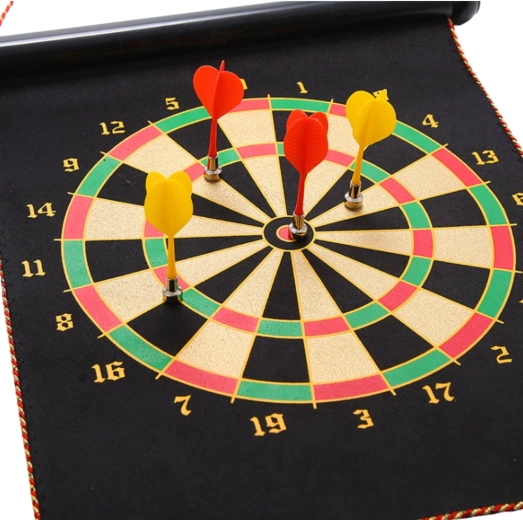 Joc sigur și distractiv pentru copii și adulți: țintă magnetică cu două fețe, dimensiuni 32 × 54 cm, cu șase săgeți magnetice. Datorită vârfurilor magnetice fără extremități ascuțite, nu există risc de deteriorare a pereților sau de rănire. Oferă atât țintă clasică de darts, cât și cercuri concentrice de antrenament, agățare ușoară cu șnur și design rulabil pentru transport facil în tubul practic.