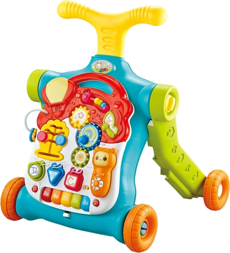 Pe panou vei găsi un pian cu tonuri, butoane luminoase și sonore, elemente rotative, sortator de forme, mărgele și componente glisante. Datorită acestora, copiii își antrenează priza, logica, concentrarea și imaginația. Blocarea roților și construcția solidă sporesc siguranța, iar plasticul de calitate oferă durabilitate.