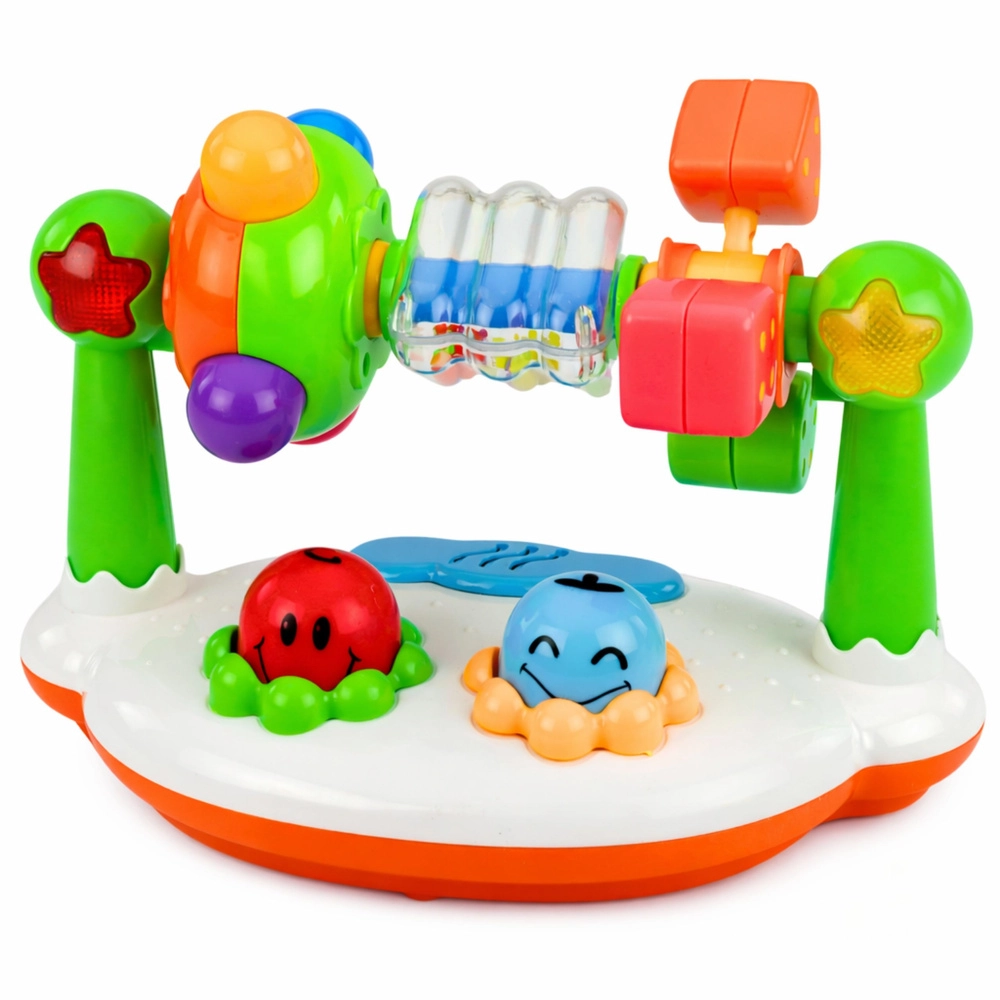 Ruloul transparent cu biluțe emite sunetul caracteristic al zornăitorii, iar toba rotativă și elicea cu protuberanțe susțin prinderea și coordonarea.
