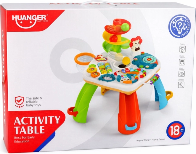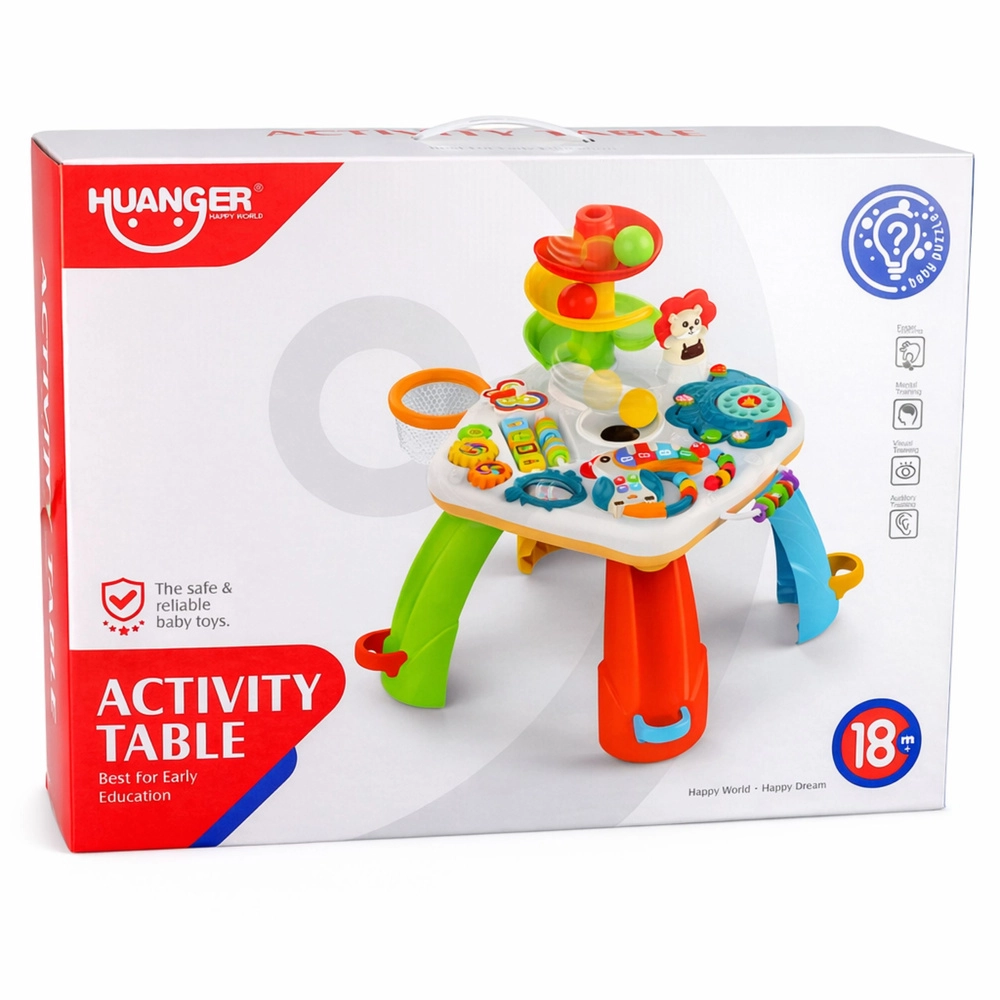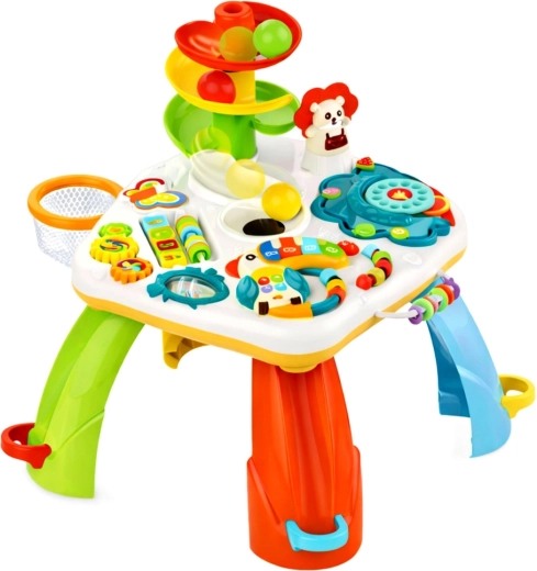 Descoperiți lumea jocului și a învățării cu o măsuță multifuncțională care îi motivează pe copii să exploreze și să experimenteze. Datorită pianului cu melodii, elementelor rotative și glisante, mini abacului și coșului pentru aruncat, copiii își antrenează concentrarea, gândirea logică și abilitățile manuale. Toboganul pentru mingi adaugă un element surpriză și menține atenția pentru mult timp.