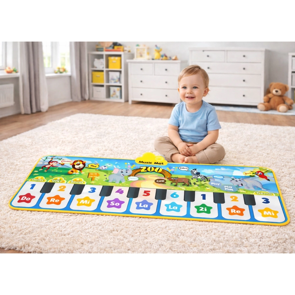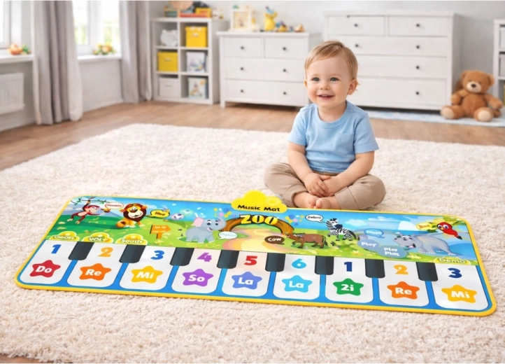 Covorașul muzical cu tematică zoo transformă fiecare pas sau atingere într-un ton, o melodie sau un sunet de animal. Clapele mari și colorate, marcate Do–Re–Mi și cu numere, îi încurajează pe copii să descopere muzica prin joc, în timp ce ilustrațiile prietenoase cu leul, zebra sau hipopotamul le mențin atenția.